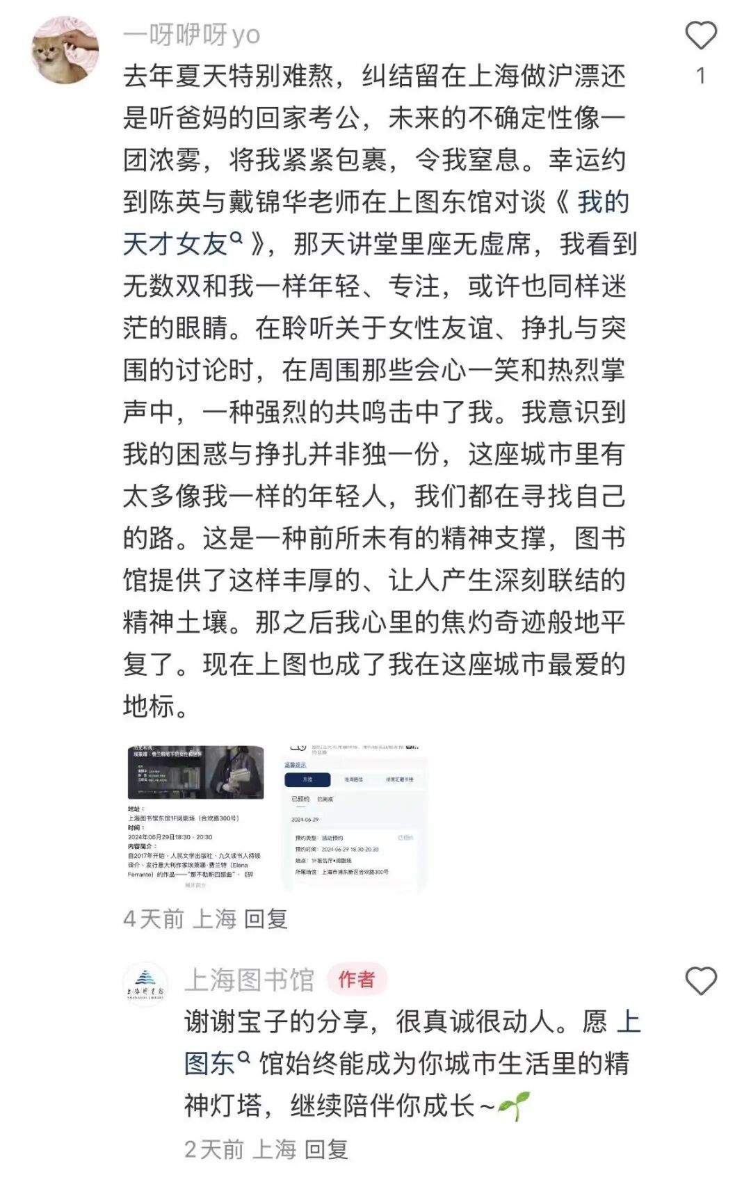 每一个自我都是在和世界的碰撞中形成的,图书馆在这份迷茫与不确定中提供了某种深刻的连接。小红书读者@一呀咿呀yo在东馆参加了“历史和我:埃莱娜·费兰特笔下的女性和世界”讲座,产生了强烈的共鸣。她说:“在周围那些会心一笑和热烈掌声中,我意识到我的困惑与挣扎并非独一份......图书馆提供了这样丰厚的、让人产生深刻联结的精神土壤。”