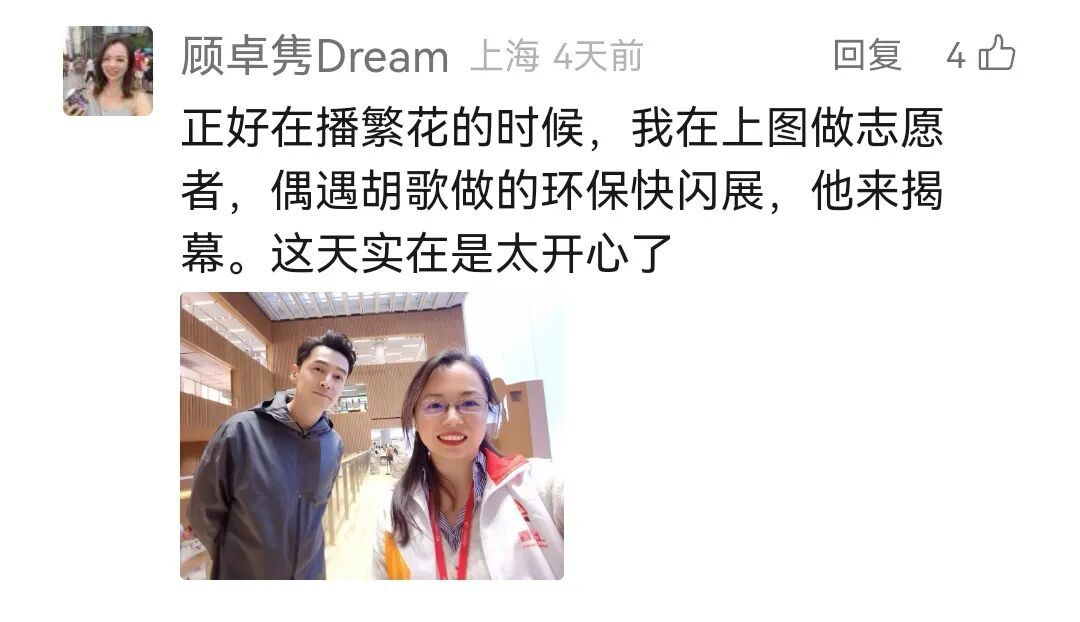 在图书馆偶遇最喜欢的演员是什么体验?微信读者@顾卓隽Dream来东馆做志愿者,偶遇胡歌为“星火·《一路前行》探索可持续生活展”揭幕,留下了开心的自拍合影。
