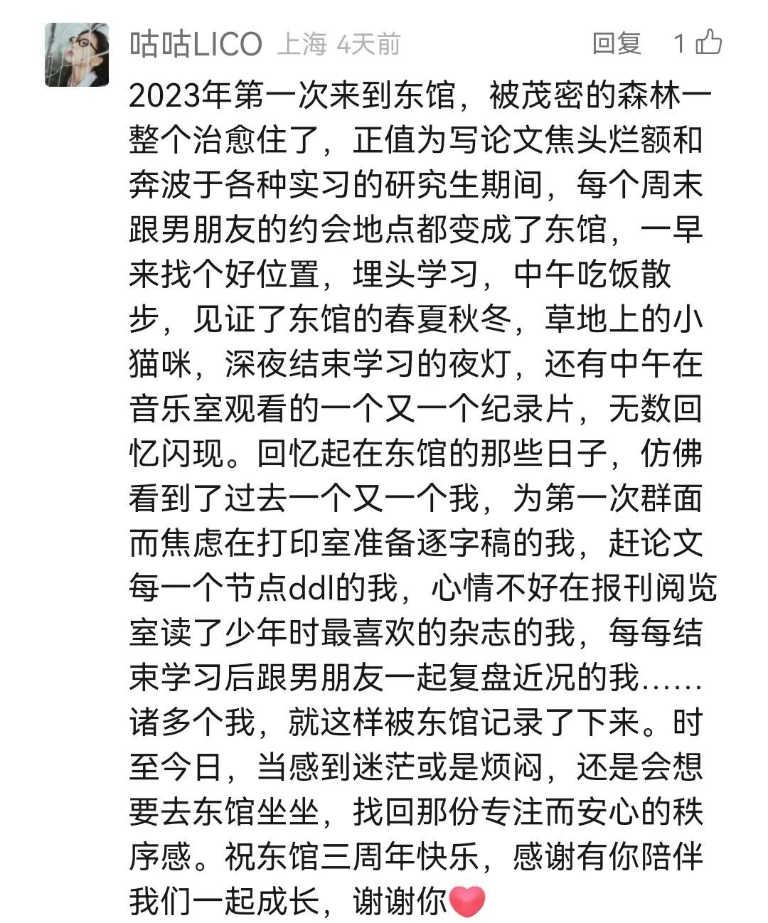 微信读者@咕咕LICO第一次来到上图东馆是2023年,正值毕业季的她在东馆留下了一个又一个努力的身影。时至今日,每当自己感到迷茫时,还是想回到东馆,去寻回“那份专注而安心的秩序感”。