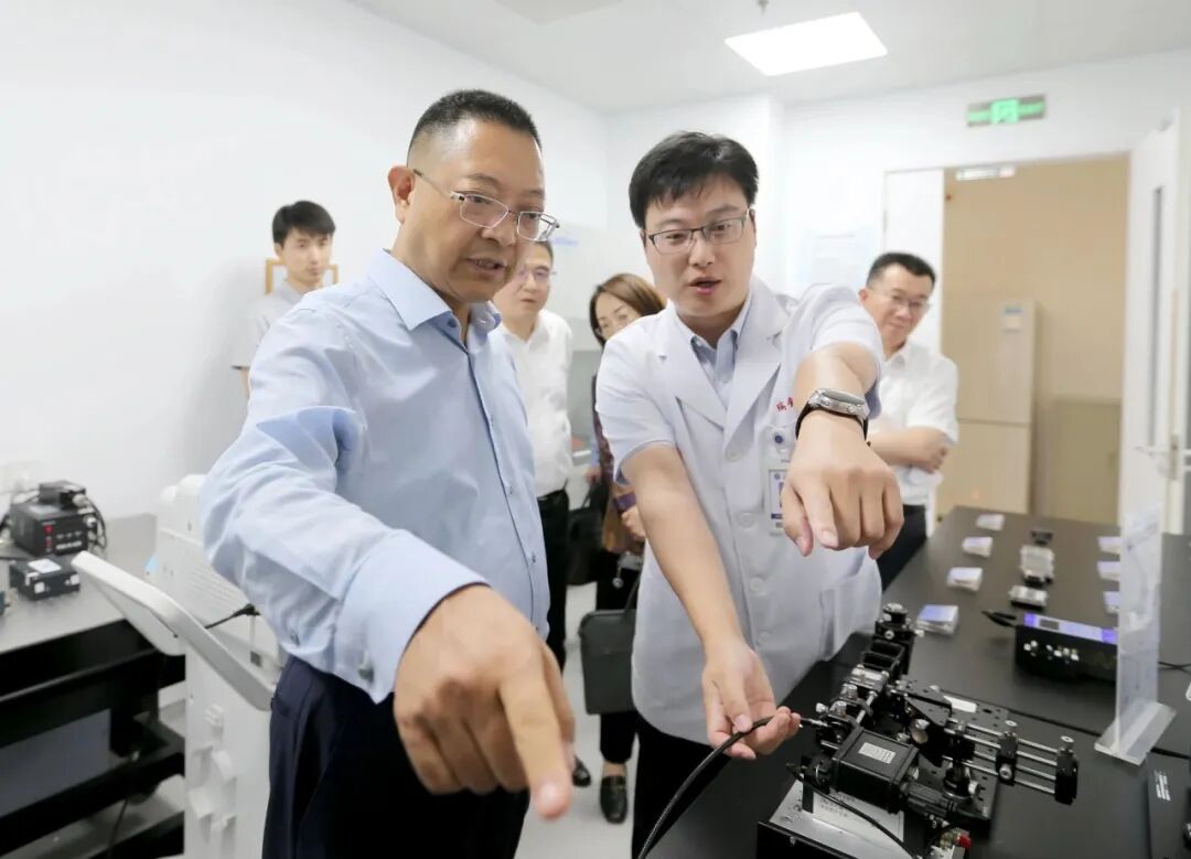 在瑞金医院医学芯片研究所,肖文高察看了研发团队的近期研究成果,并走进相关实验室,听取无创血糖检测技术发展情况以及相关研究进展,同上海械谷、瑞金创新中心、瑞金医院医学芯片研究所相关负责人座谈,就探索科研成果转化及区域协同创新等,与大家深入交流讨论,围绕下一步发展所需解决和突破的裉节问题开展现场办公。