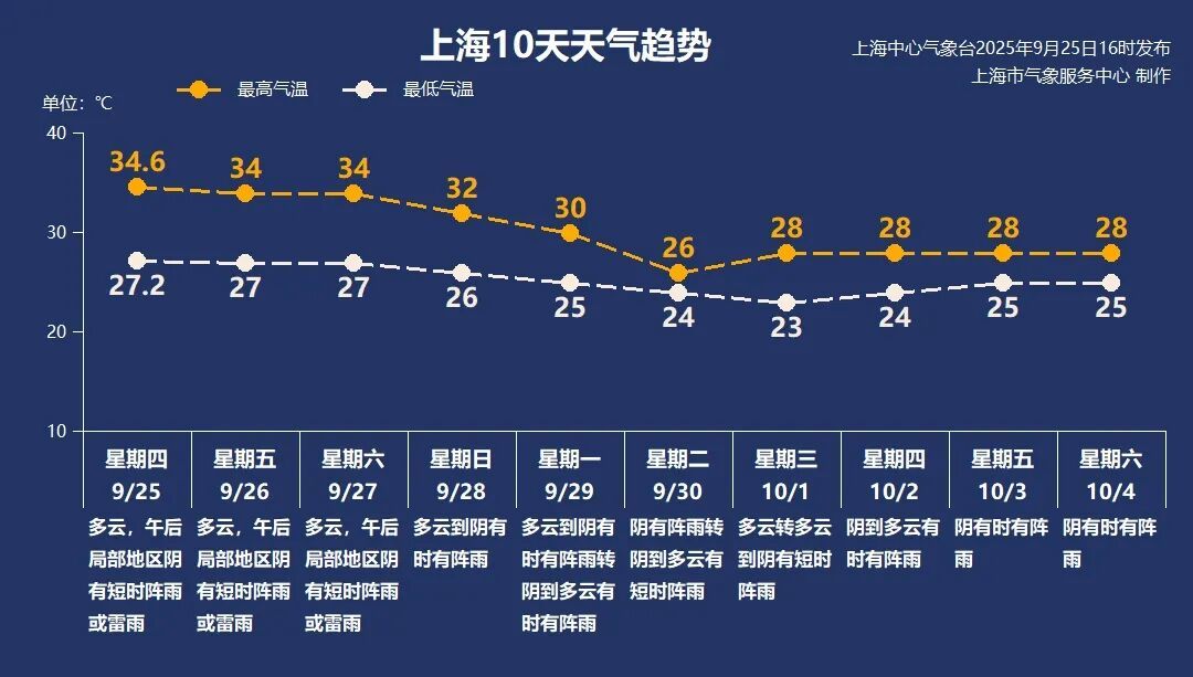 下周起申城处在副高北侧边缘,本市多阵雨天气过程,气温终于有所下降,最低气温23~25℃,最高气温26~30℃。