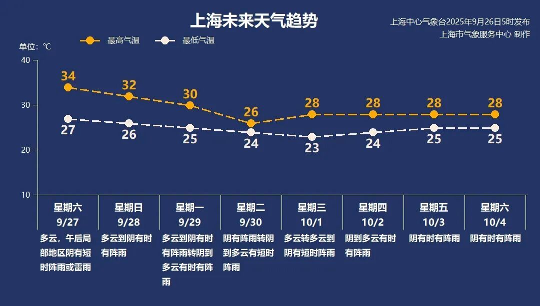 9月30日(周二):阴有阵雨转阴到多云有短时阵雨,24~26℃