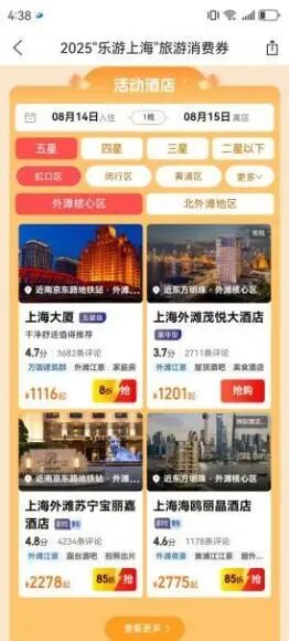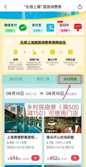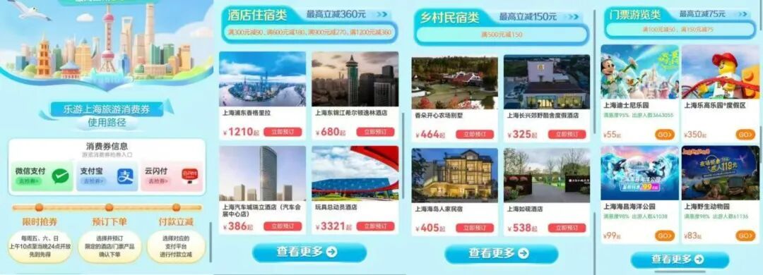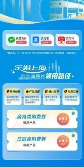 限时福利惊喜来袭,国庆中秋,等你来上海玩! 市文化旅游局介绍,9月26日至28日上午10:00,2025下半年“乐游上海”旅游消费券将开启领券使用!消费券使用有效期从领到券日起,共有7天。请抓紧领取您的优惠权益,畅享便捷实惠的上海旅游体验吧!如何查询可用券商户&核销用券?详见↓ 下半年市文旅局对活动规则进行了优化升级,请大家在参与之前留意一下最新规则: 新增券种:下半年活动市文旅局在住宿券品类里加入了满500减150的乡村民宿券,可用于指定的“乡村民宿”商户,仅限线上预定时使用,以此来丰富大家的选择。但该民宿券不可用于其他住宿商户,其他四档住宿券也不可用于“乡村民宿”商户。 使用期限:每张消费券的有效期为7天,从领到券日起计算,最晚可在下个星期同一日的前一晚24:00前核销使用(即本周五领取的消费券,可在下周四晚24:00前使用),逾期未使用自动作废。 产品预订:8月份和9月份领到的消费券,无论是住宿券或游览券,预订离店/出游期限最迟为2025年10月8日24:00(优惠权益覆盖国庆、中秋假期)。请消费者关注相关平台提示,早安排早预订早享优惠。 特别告知:国庆、中秋长假期间没有旅游消费券发券安排,下次发放于10月10日启动。 如何查询可用券商户&核销用券? 这篇攻略请收好! 一、门店柜台支付类 银联平台的消费券分为在线预订支付类(线上核销)和门店柜台支付类(线下核销),两类券适用场景不同,互不通用。其中,门店柜台支付类消费券为银联云闪付App专属消费券。平台特别推出商户查询地图模式,消费者可以便捷掌握所在地附近的可用券商户信息。 云闪付App 查询商户:拥有门店柜台支付类消费券的消费者,可以打开云闪付App首页搜索“乐游上海”,或点击首页“本地精彩”—“乐游上海”专区,进入活动页面,下滑页面找到商户查询专区,点击“立即查看活动商户名单”或“地图模式查看线下活动门店”,浏览或搜索可用券商户。 核销用券:拥有门店柜台支付类消费券的消费者,在相关商户的门店柜台结账时,现场出示云闪付App付款码支付,即可享受消费券满减抵扣优惠。 二、酒店集团App/小程序支付类 下半年参与的商户基本延续上半年,消费者可登录酒店集团App或小程序,预订上海地区酒店。若订单满足消费券使用门槛,将在支付环节自动扣减。 三、在线预订平台App/小程序支付类 消费者还可以在携程、飞猪、美团、去哪儿、同程、抖音、东方购物、看东方、中旅旅行、春秋旅游、途牛等在线预订平台,查询商户并核销用券。 查询商户:登录各预订平台App,搜索“乐游上海”,进入活动页,点击“查看更多”,浏览可用券商户;或微信搜索“乐游上海”,进入“乐游上海旅游消费券”微信小程序,点击底部“住宿&游览券可用商户名录”,跳转至预订平台的微信小程序,即可在活动页浏览可用券商户。此外,请消费者特别留意一下新增的乡村民宿频道。 核销用券:进入活动页,选择可用券商品,填写订单信息后,选择消费券对应平台进行支付。若订单满足消费券使用门槛,将在支付环节自动扣减。 携程旅行App 飞猪旅行App 美团App 去哪儿旅行App 同程旅行App 抖音App 东方购物App 看东方App 中旅旅行App 春秋旅游App 途牛App