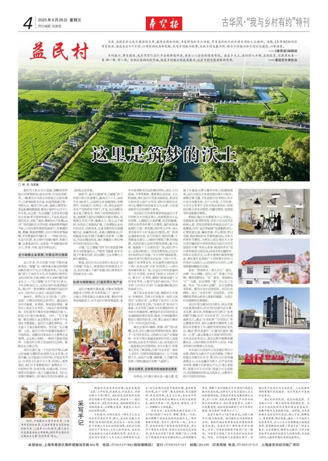 当前,我国农村正发生着深刻变革,展现出崭新面貌、丰富样态和多元功能,孕育着新时代的乡村文明和人文精神。近期,《奉贤报》协同区作家协会,遴选本区9个乡村,以作家的视角和笔触,采写乡村振兴故事,反映乡村发展历程,助力乡村振兴和乡村文化建设,以飨读者。 ——《奉贤报》编辑部 乡村振兴,事关国运,也是作家们当仁不让的奔赴所在,更是心心念念的情感寄托。在这个点上,我们深入乡村,走向农家,近距离地看一看,聊一聊,写一写。这些汇集的采风作品,既是乡村振兴的成果展示,也是乡村发展的探询思考。 ——奉贤区作家协会 航拍无人机在空中盘旋,俯瞰绿荫环抱中的奉贤新城,由北向南,首站是西渡,看,一幅美丽乡村的立体图卷正在徐徐展开。这里南临数字江海,北接西渡浦江第一湾核心区,毗邻大叶公路,金海公路贯穿,直达虹梅南路隧道,距离上海市中心仅半小时车程。在这里,“弘正储能”主营业务已辐射全球40多个国家和地区。千亩农田依托现代技术,实现了高效、精准的生产管理。由旧厂房改建的艺术空间里,青春的笑声抛向天际。从市区驱车前来的游客们,带着遮阳帽、墨镜,裸露着臂膀,在村口梯田旁喝咖啡,享受惬意的休闲时光……传统与时尚,生态与经济,本土情怀与国际视野,和谐交融,这里是益民村,这里是一片创新创业的沃土,有家,有根,也有诗和远方。 全力助推企业发展,村委会两次搬家 近几年来,作为实现“双碳”目标的重要角色,“储能”这一国家重点规划布局的战略性新兴产业正在加速发展。“弘正储能”成立于2021年9月。作为国内少数具有全栈自研3S系统(BMS、PCS、EMS)能力的企业之一,“弘正储能”去年产值3亿多元,今年目标10亿元,还将在国外组建销售团队。像这样一家发展势头强劲的科创民营企业,当初为什么选择入驻益民村呢? 2018年,奉贤区正全力打造“三园一总部”大都市田园综合体项目,通过盘活农村宅基地、农用地、集体建设用地,使农村土地及生态资源,与城市产业资源链接,切实提升村集体经济增加农民收入,构筑乡村振兴新高地。当时,“弘正储能”联合创始人金志强等在上海多个产业园区考察选址。益民村交通优势明显,率先进入了金志强的视线。为引进“弘正储能”入驻,益民村对村内基础设施进行了升级改造,还腾出村委会办公大楼供企业使用。企业刚入驻时,一时找不到食堂厨师,村里及时安排了合适的村民顶岗,解除企业后顾之忧。 成功引进只是一个良好的开局。以满心的诚意与满腔的热情助力企业发展,实现共赢,这才是益民村的目标。村党总支书记、村委会主任金平话不多,但细心,他笑着说,我们村干部都要当好“金牌店小二”,从招商引资、协同支持、优惠办理、平台打造等方面提供一揽子全链条服务,为村企发展纾困解忧,及时解决各类实际困难,全力助推企业发展。 2022年,金平注意到“弘正储能”的工作群人数在快速增长。最初五六十人,2022年有100多人。这说明企业发展得快,发展得好,他很高兴,但转念一想,那企业的研发生产空间肯定不够了。于是,他主动联系金志强了解需求,果然与他预判的情况一致。他梳理了益民村闲置的村集体用地,发现要么空间不够、规模太小,要么过于破旧,如果动工重建或扩建,又会增加企业的时间成本、经济成本。在竞争激烈的全球储能行业,谁赢得先机,谁就占据制高点。时间就是效益!村班子商量后决定第二次搬迁,给企业腾出场地,他们则搬到上世纪90年代的村委会办公地。 目前,“弘正储能”每年为村里创造180多万元的租金收入,产值突飞猛进,此举实现了村集体经济、农民增收、企业发展壮大的共赢局面。 眼前,益民村正以优质的头部企业“弘正储能”为龙头,因地制宜发展新质生产力,逐步打通上下游产业链,吸引更多的科技创新企业入驻。 自然与精致融合,打造田园文旅产业 益民村地理位置优越,村集体闲置用地根本不愁租。曾有家具加工厂、建材厂、仓储公司等低端企业前来求租,都被村里委婉地拒绝了。对于益民村的发展前景,金平有着清晰而坚定的规划目标。他说,乡村招商,不单看税收,更要看社会效益、文化附加值。我们益民村需要对接的是,来自市区的优质文旅产业资源,同时引进的还有市中心精致时尚的海派文化元素,从而逐步提升村民的视野与素养。 来自徐汇区的青年黄思琦是益民村孚日田野艺术空间主理人。他曾租赁市中心的别墅、文创园区打造影棚,但空间规模、自然光影等条件都不太理想,高昂的租金也制约了进一步发展。2023年上半年,他从市区驱车半小时来益民村勘景。老厂房周边清澈的河流,成片的稻田,晚风吹拂,夕阳静谧而美好,让他顿时摆脱了都市的喧嚣,沉浸在原生态的田园风情里。毫不犹豫,他就租下了这里的老厂房。相比市中心,这里面积更大,空间可塑性强。经过半年时间的设计改造,“孚日田野”脱胎换骨,2024年春节后即开始试运营,不到一个月,就接了20多单业务,知名演员关晓彤也成了第一批来这里“试水”的明星之一。曾经废弃破旧的老厂房,经过设计师的创意构思与艺术呈现,这里成了时尚文艺场所。T台、聚光灯、走秀场,模特们踩着动感十足的音乐节奏,大都市气息扑面而来。“孚日田野”让村民们在家门口就能领略高品位的海派文化。 除了商业资本的入驻,集稻田艺术展示、休闲娱乐、传统文化体验为