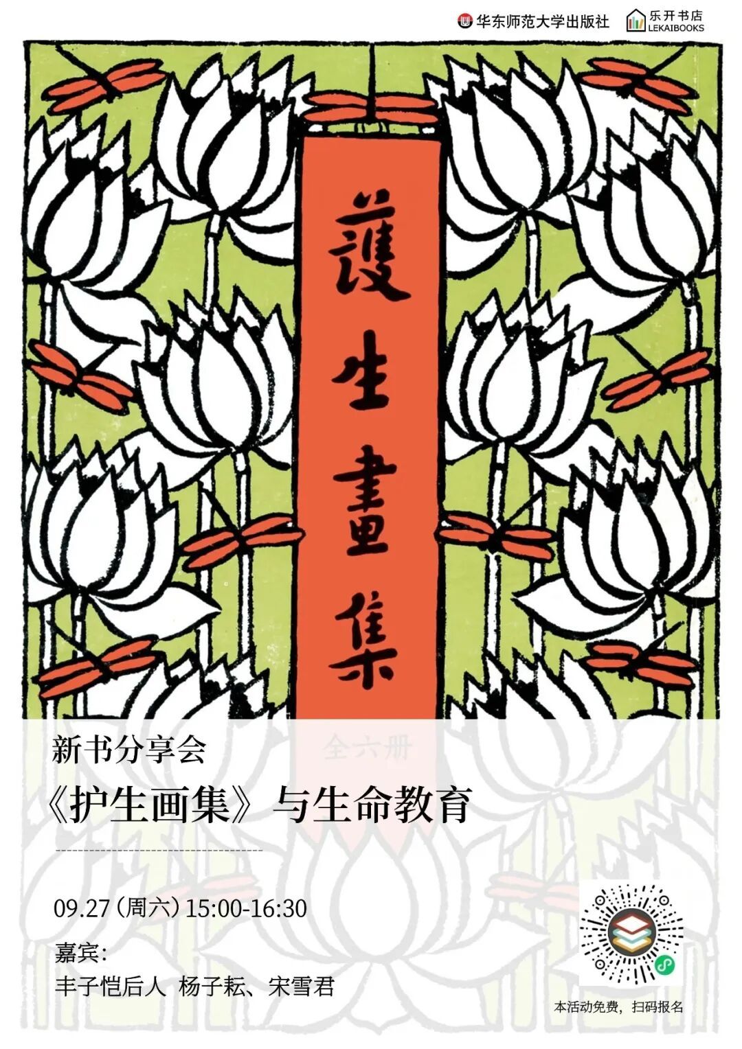 展览开幕当天(9月27日)15:00,乐开书店还将举办《护生画集》新书分享会,特别邀请丰子恺后人杨子耘、宋雪君两位老师,讲述他们眼中的丰子恺,以及生命教育的重要意义。