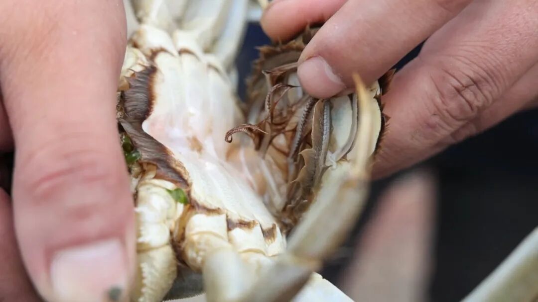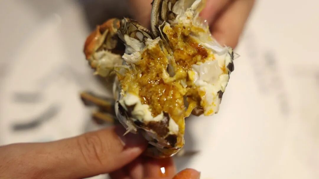 在昆秀水产养殖基地,蟹农也已初尝丰收喜悦。蟹塘捕捞上来的大闸蟹,经过蟹农逐个检查精选,让品质更有保障。这些“优质选手”被打包封箱,供食客尝上今秋第一口鲜味。从现场随机掰开的两只熟蟹来看,蟹黄已泛着油光,令人垂涎。