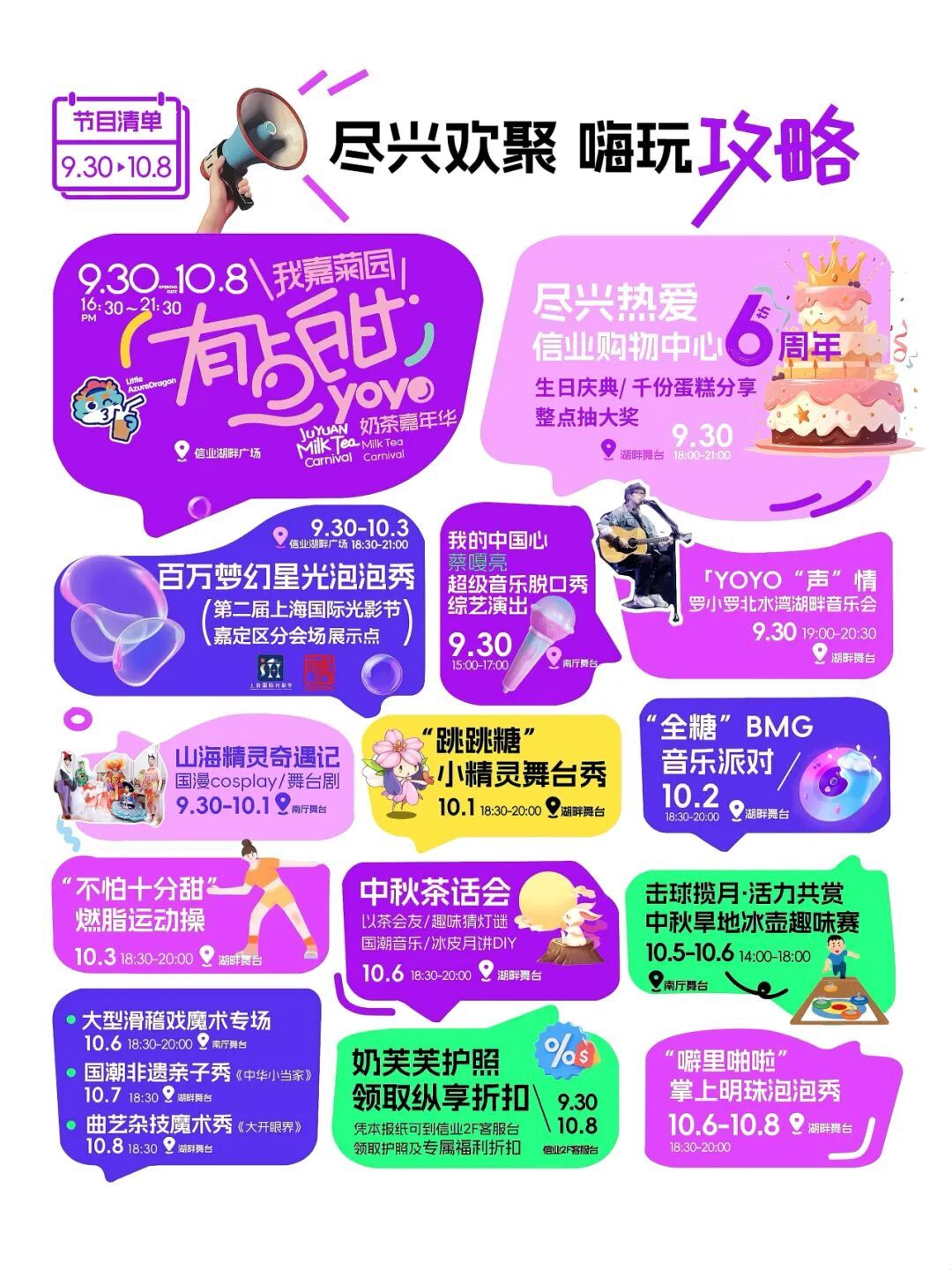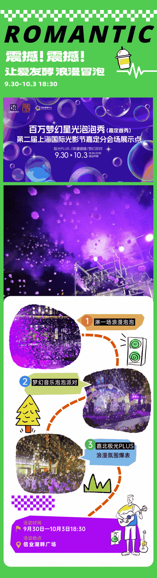 这次嘉年华还和第二届上海国际光影节嘉定分会场梦幻联动!9月30日-10月3日的百万梦幻星光泡泡秀(嘉定首秀)可别错过,极光PLUS、浪漫啵啵、梦幻派对,灯光与泡泡交织,宛如置身童话世界,拍照打卡超惊艳。活动期间,整个信业广场在四维灯光网络的装点下,变成“不夜城”,氛围感直接拉满。