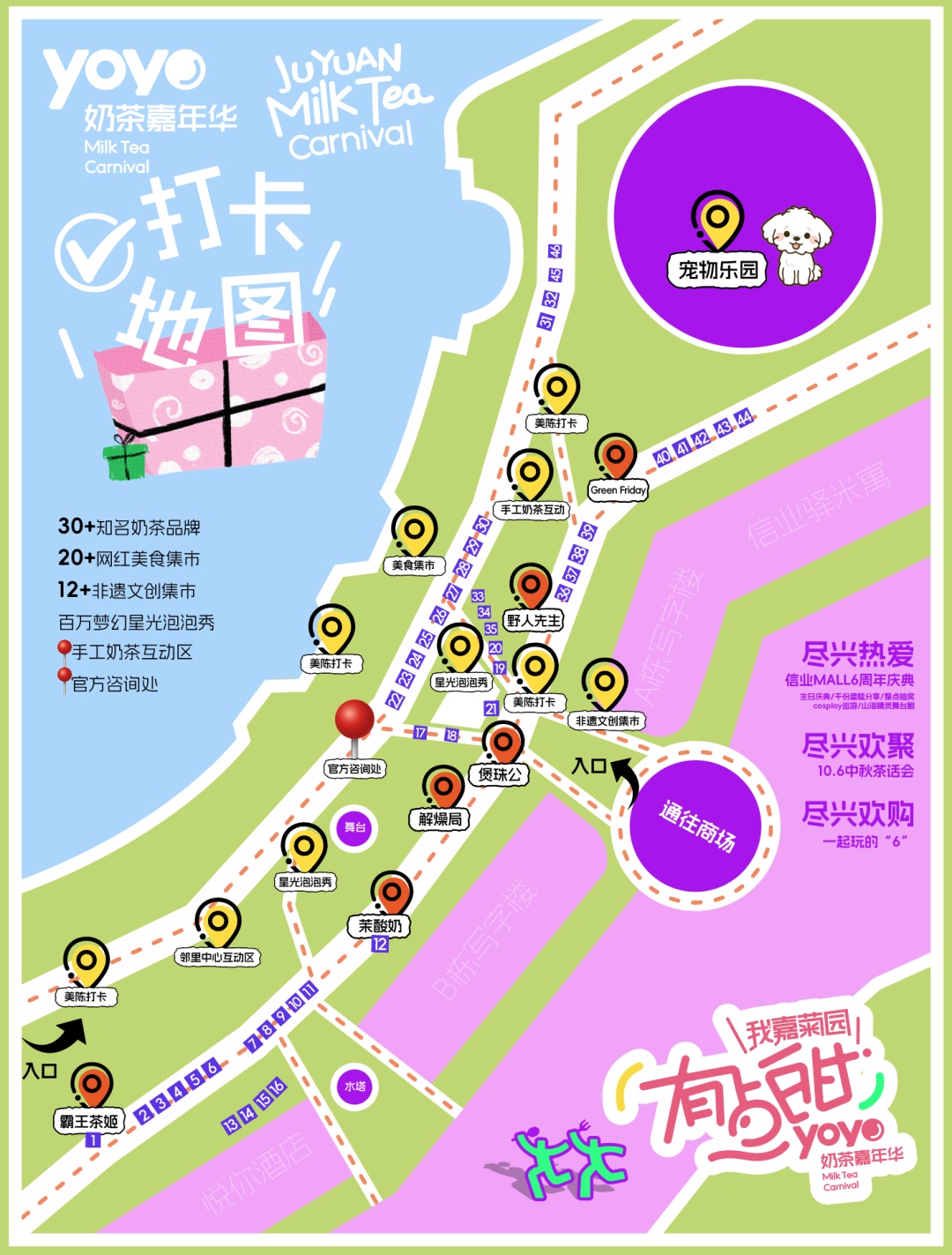 活动现场设有超美的美陈打卡点,还有手工奶茶互动区,让你亲手体验制作奶茶的乐趣。要是带了萌宠,宠物乐园就是它们的欢乐天地!