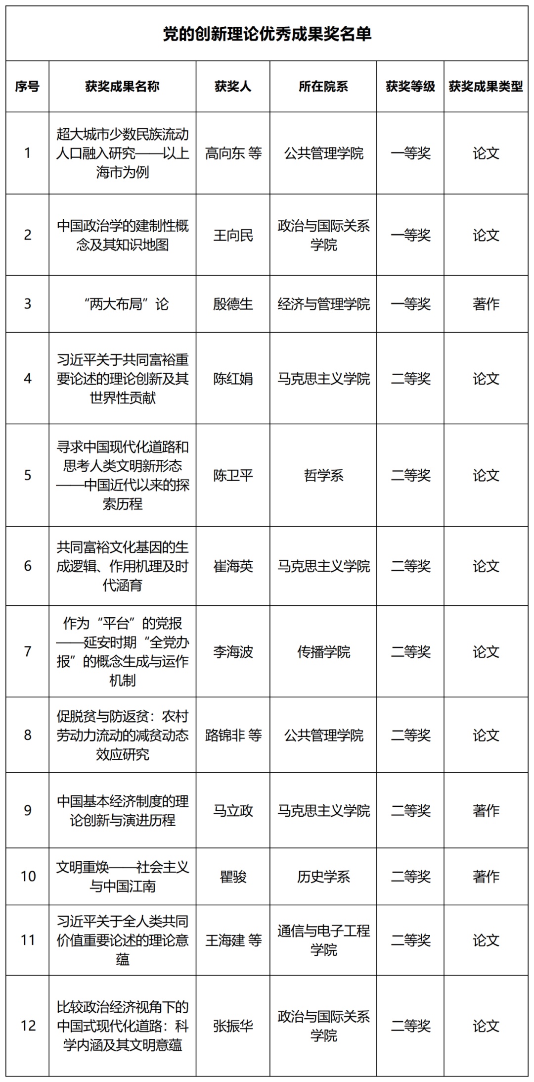 马克思主义理论学科获奖成果,聚焦“党的创新理论阐释与传播”,进一步回应“马克思主义如何中国化”的核心问题,为党的创新理论“飞入寻常百姓家”提供学术支撑,直接服务上海“党的创新理论研究高地”建设。