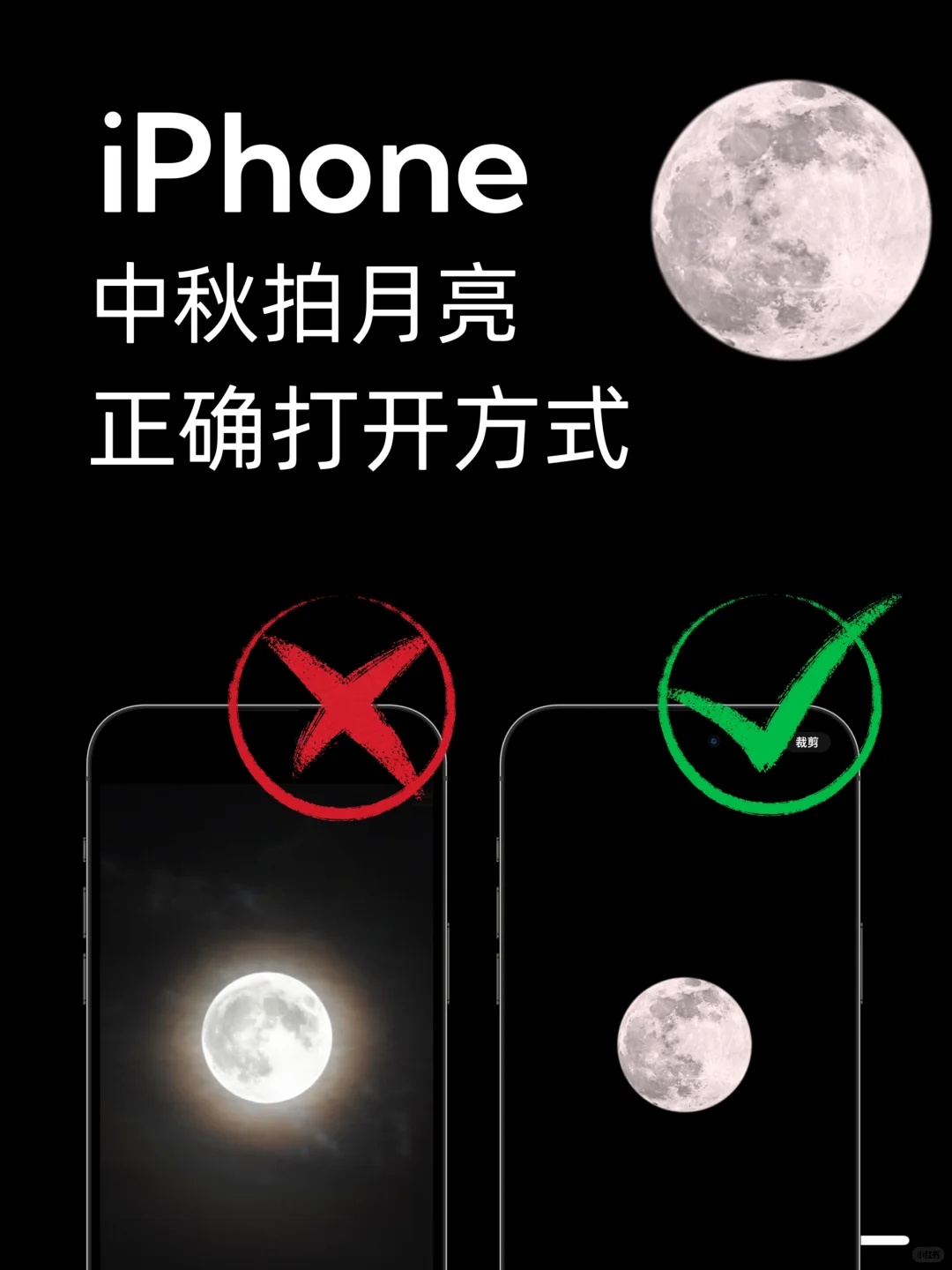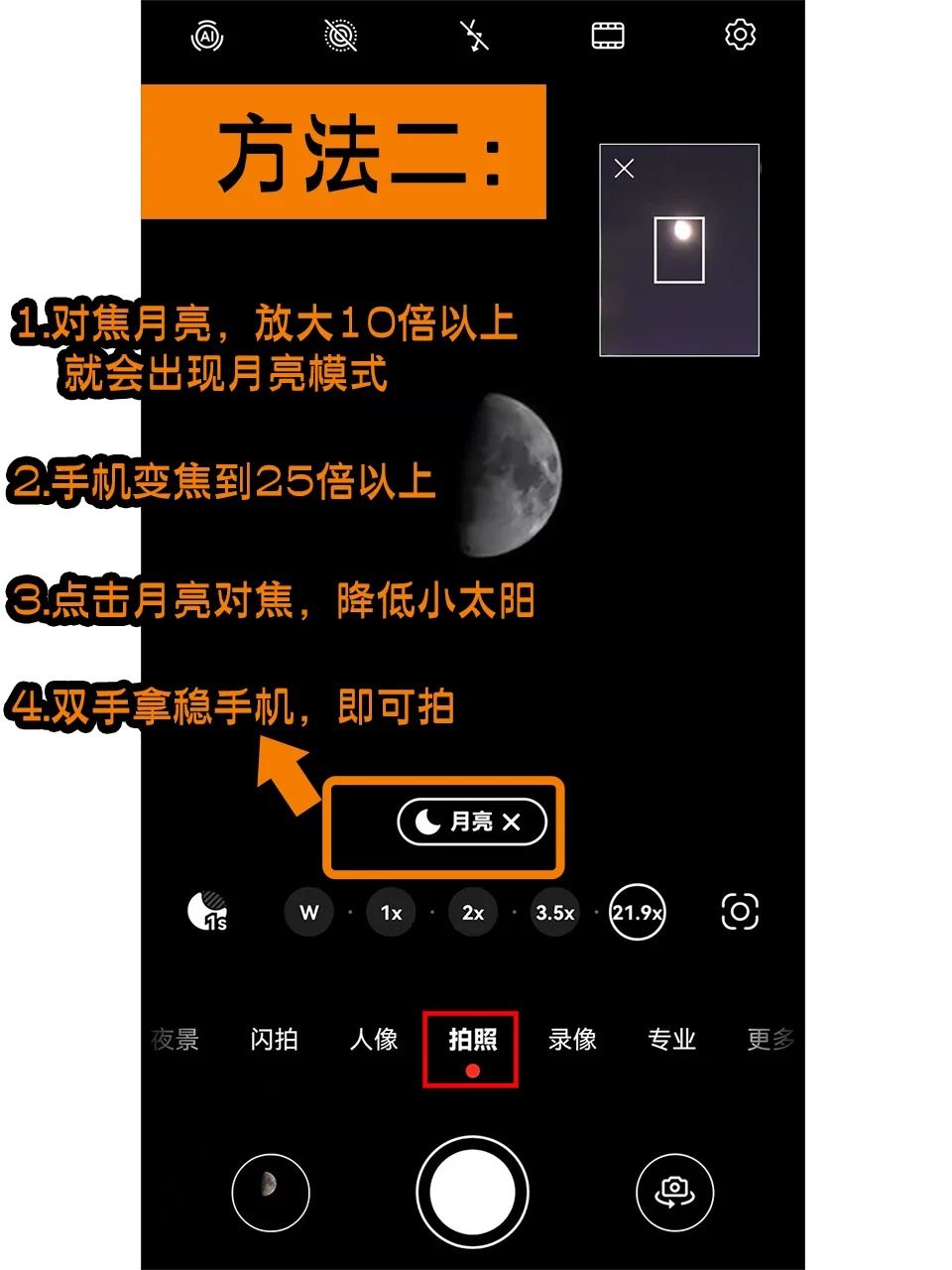 1️⃣对焦月亮,放大10倍以上,就会出现月亮模式