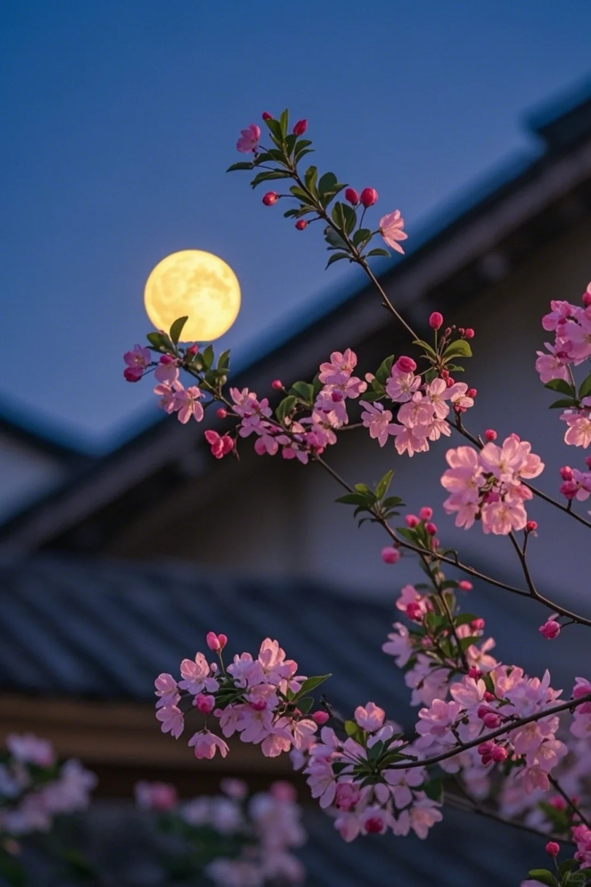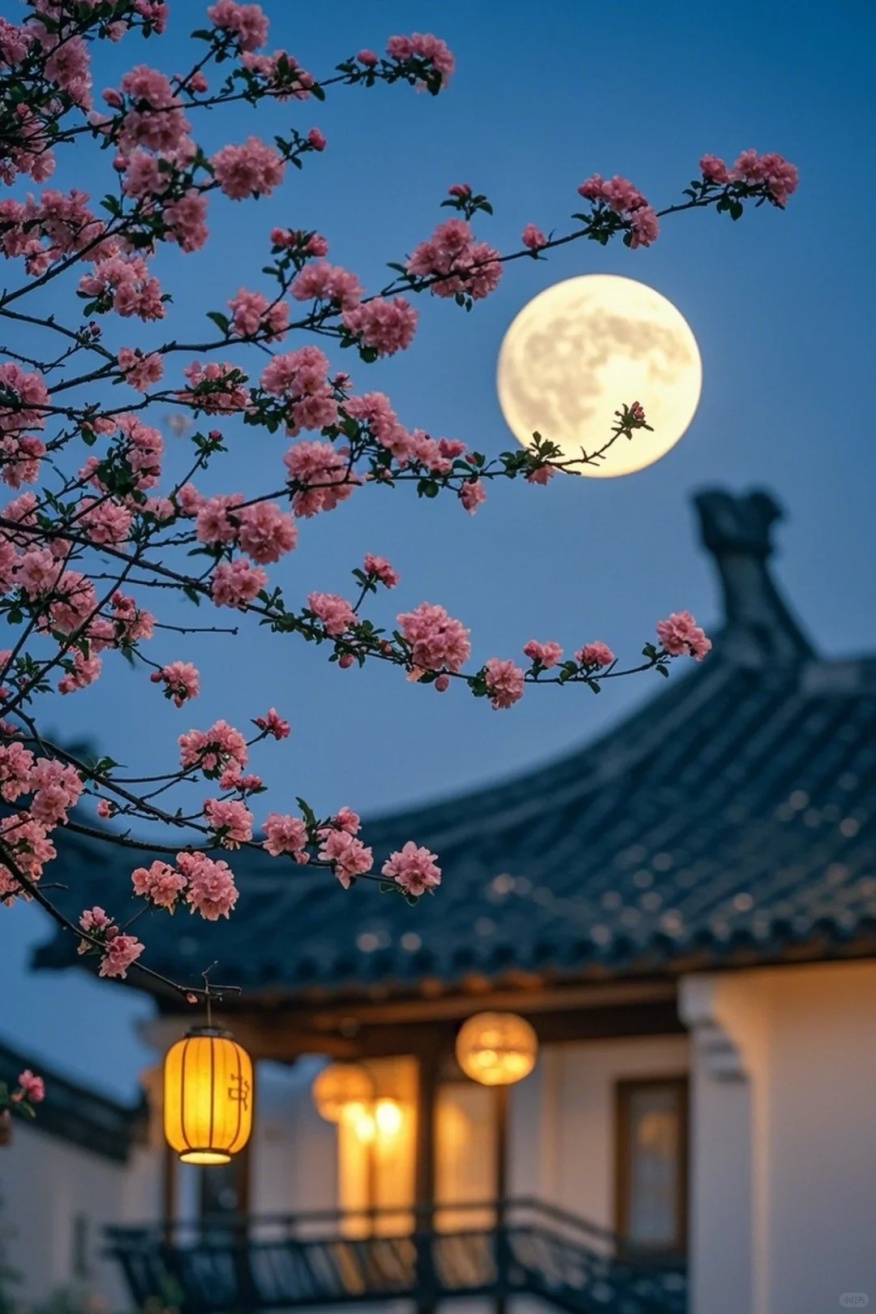 • 框架构图:利用灯笼、树枝缝隙框住花朵与月亮,比如让灯笼的暖光和冷调月光对比,层次更丰富。