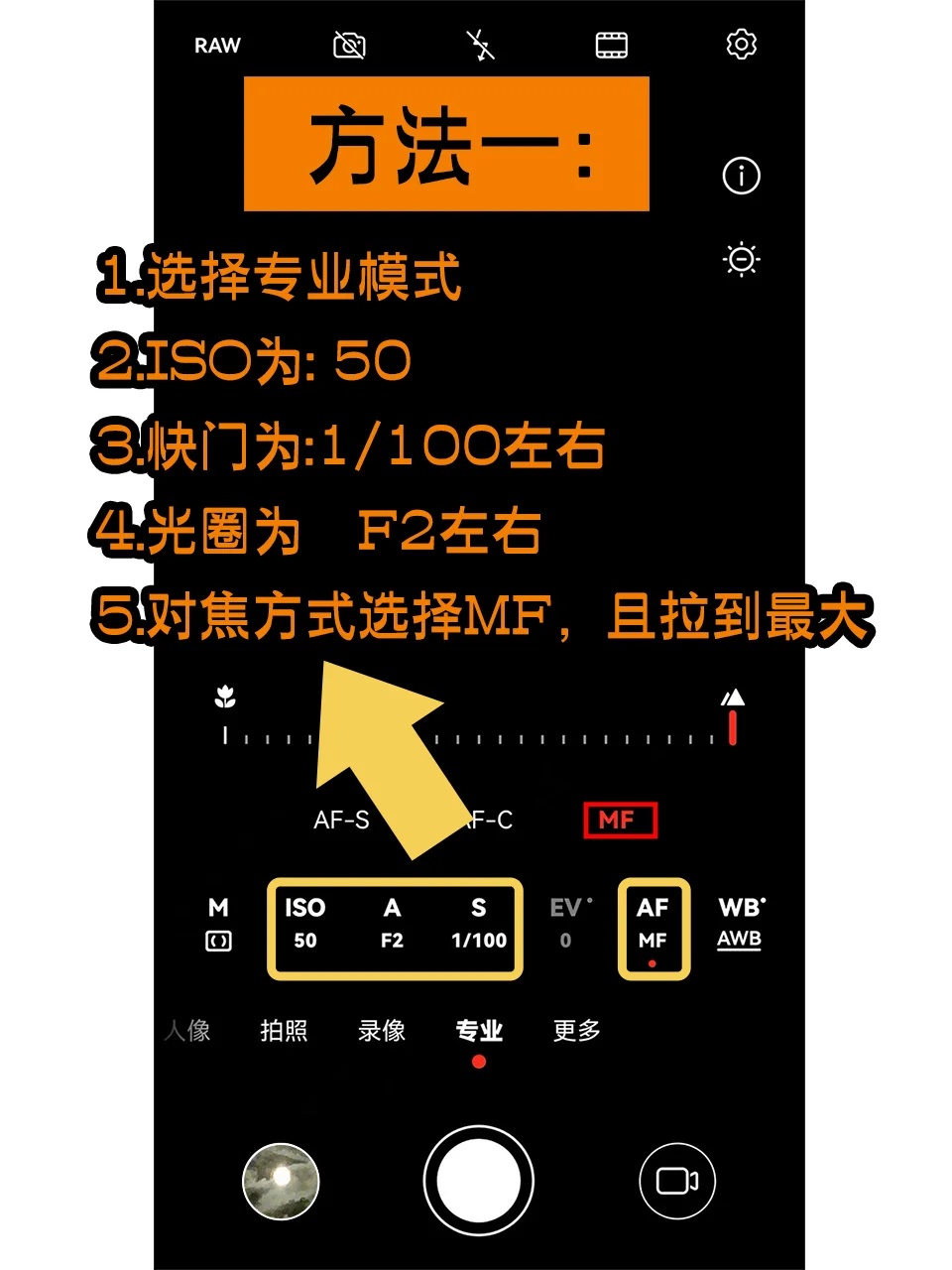 4️⃣光圈为:F2左右 5.对焦方式选择MF,且拉到最大