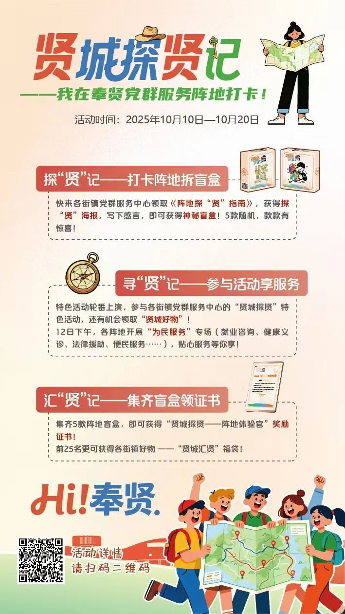 10月10日至20日,区党建服务中心携手各街镇党群服务中心,发起贤城探“贤”活动,邀请全区党员群众打卡身边的党群阵地,共同感受党建引领下的城市温度。参与打卡,还能解锁阵地盲盒,开启隐藏惊喜!