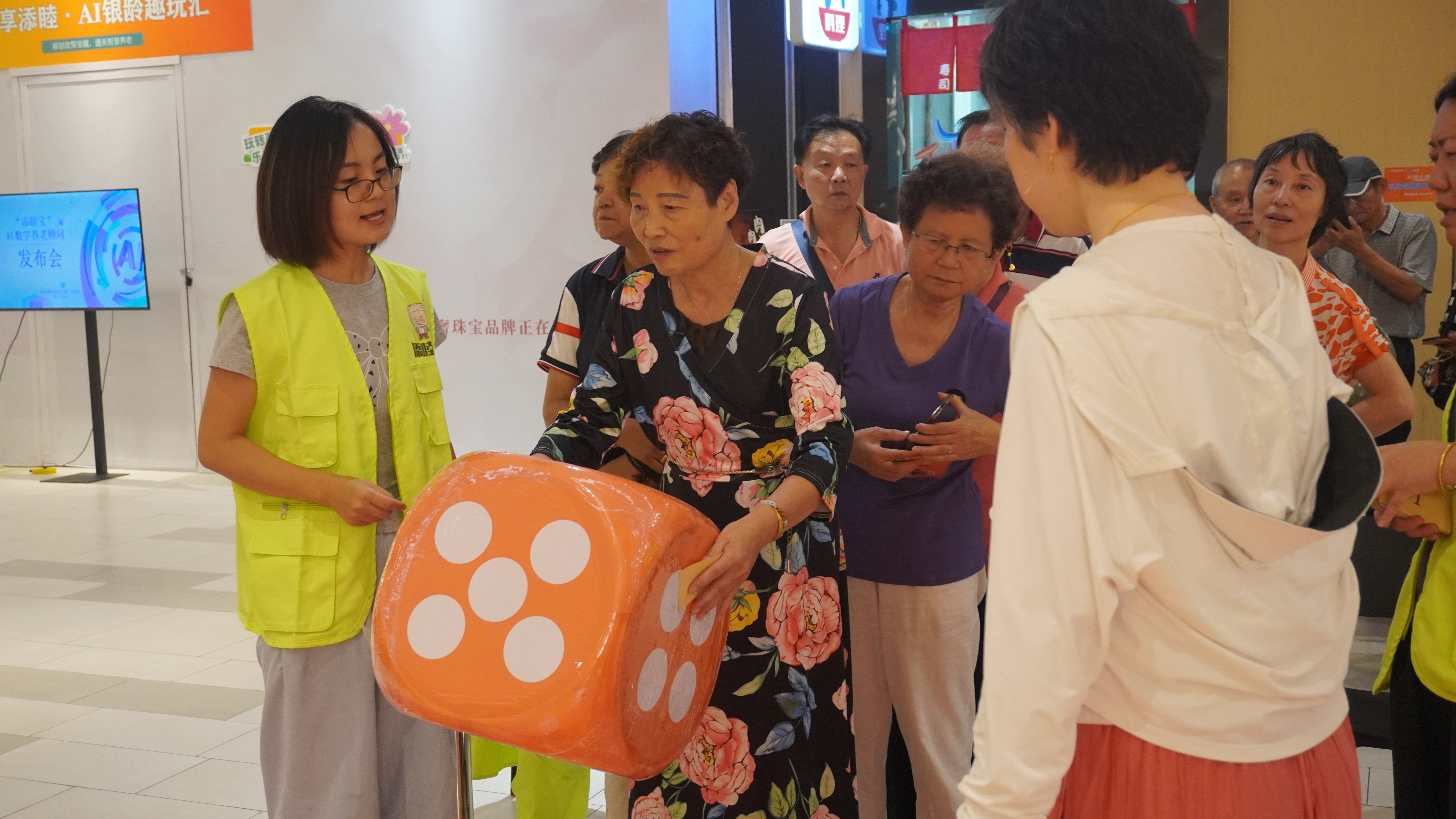 “寻忆大富翁”游戏区前人头攒动,“翻出花样”的绳圈勾起了童年的回忆,“千锤百炼”的挑战考验着眼手协调……老人们通过投掷骰子获得对应怀旧互动游戏的体验任务,完成游戏任务获得印章后,再去对应的咨询点位抽取政策问题,工作人员通过AI数字养老顾问进行搜索,找到答案后便能获得一份精美的小礼品。一系列游戏体验增强了老人们与AI的互动频次,巩固了学习成果,降低了科技的门槛,让老人们建立了数字自信。