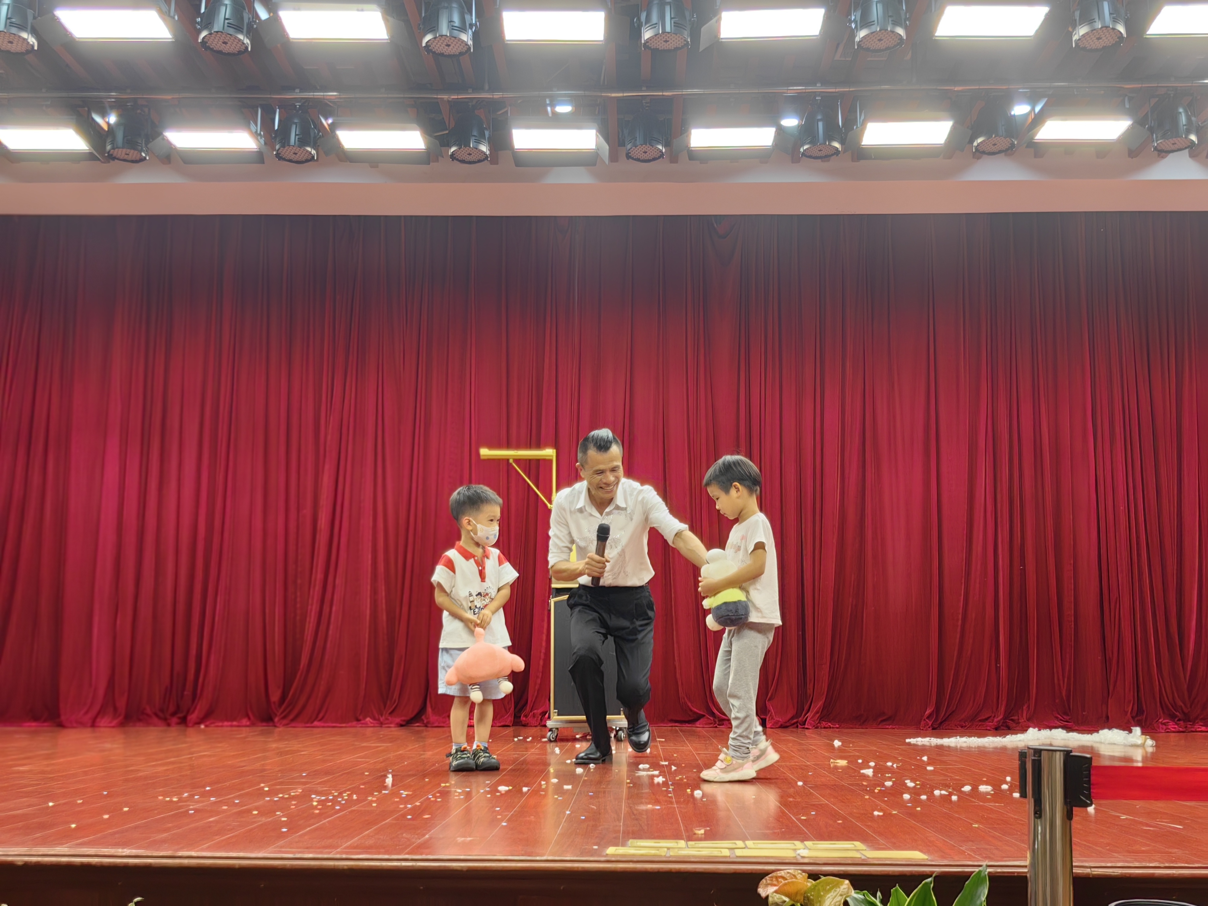 现场,他邀请了5位小朋友轮流上台,手把手教学 “糖果魔法”—— 让小朋友按住魔术盒,自己在旁“念咒语”、做鬼脸,当小朋友松开手,五颜六色的水果糖从盒中掉落时,孩子们惊喜地举着糖果向台下家长挥手。