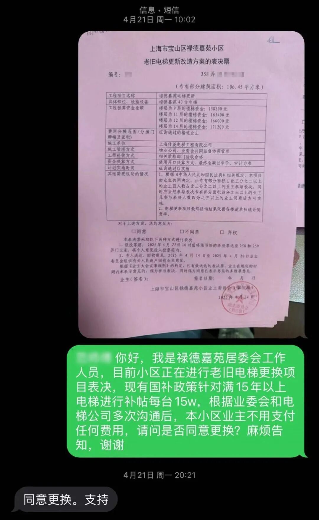 民主决策实 票选品牌+全量征询 按照会议部署,业委会迅速组织业主代表会议,全面解读政策利好与项目计划。为确保选择科学,业委会前期收集多个电梯品牌的参数、报价及售后方案,经代表逐一比对、民主投票,最终确定东芝电梯为合作品牌。 品牌敲定后,党总支与业委会组成专项小组,先与东芝授权合作方上海佳菱电梯工程公司展开多轮价格协商,在保障质量与服务的前提下争取最优成本;随后(4月14日—4月27日,征询阶段)启动全小区业主征询,业主代表分片上门讲解、居委社工通过电话微信逐户联系,最终实现全小区业主同意,明确40台电梯更换计划。