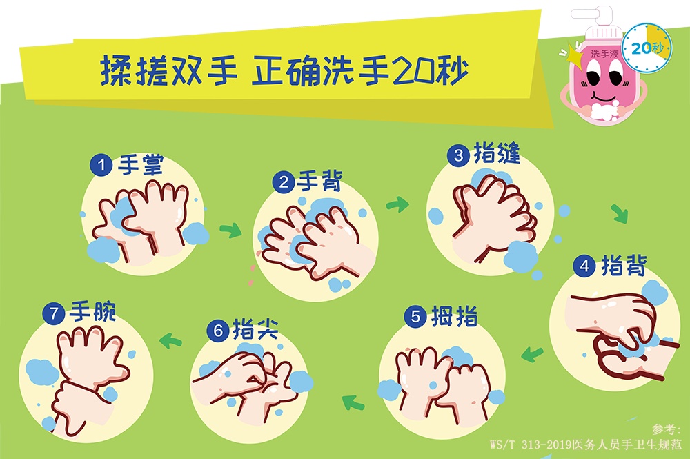 先用流动水淋湿双手,涂抹适量洗手液或肥皂,然后按照以下七个步骤(口诀:“内、外、夹、弓、大、立、腕”)揉搓双手,且揉搓时间至少要达到20秒(这个时间正好可以唱2遍生日快乐歌):