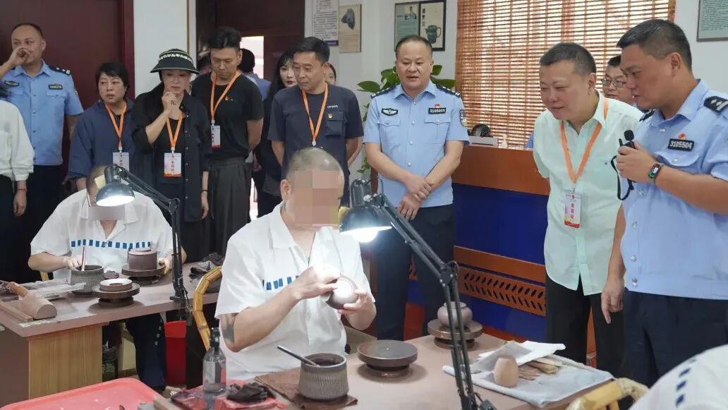 在民警陪同下,剧团演员们深入大墙,参观监狱陈列馆、法治文化阵地,观摩了“紫砂工艺”矫治项目。罪犯组成的小乐队的才艺展示和职务罪犯的“现身说法”,让艺术家们对监狱教育改造工作有了更直观的认识。