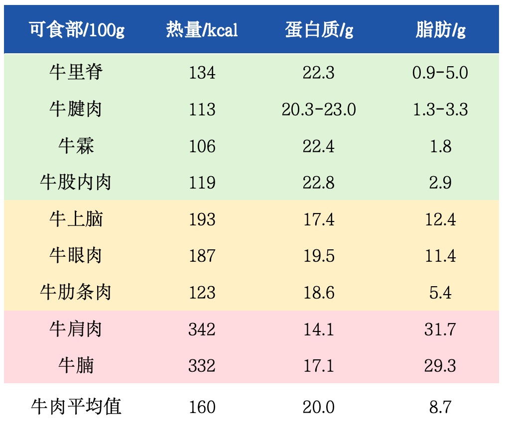 牛腩和牛肩肉:其蛋白质含相对较低,只有15g/100g左右。这些部位由于运动较少,成为牛身上的脂肪仓库,脂肪含量高达30%。每100g就有350kcal的热量,是牛里脊肉的2-3倍。热量堪比网红美食“烤油边”。