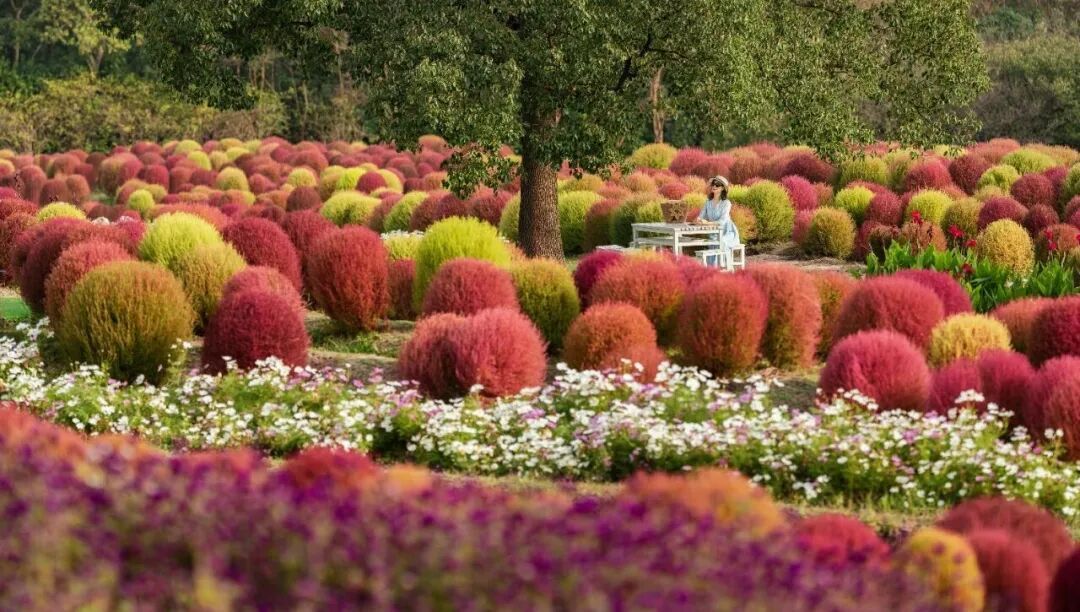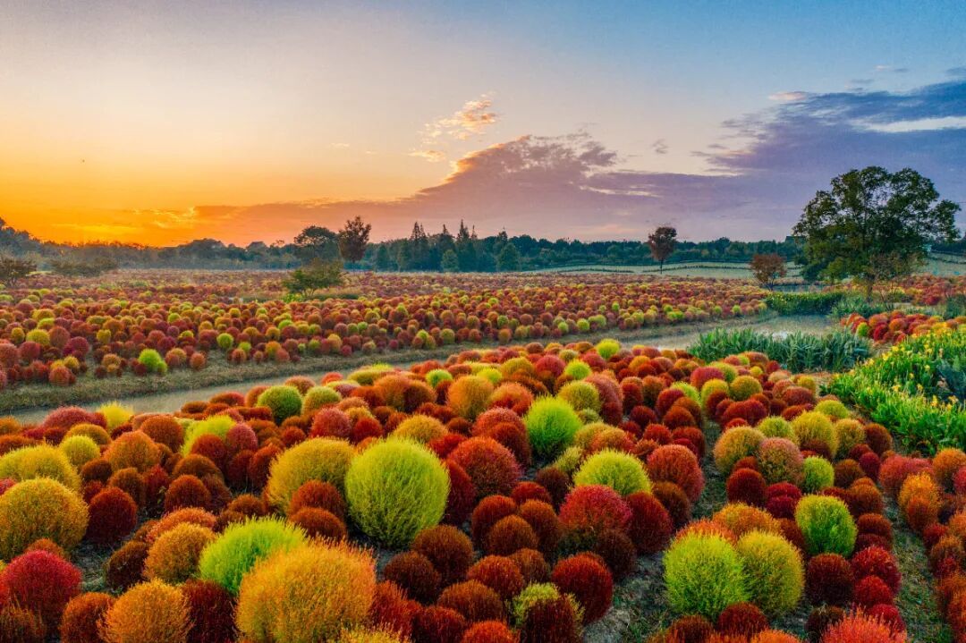 红、紫、褐、黄、绿,各种颜色的地肤相映,色彩斑斓,连绵成片。在这里拍照打卡,出片率超高。