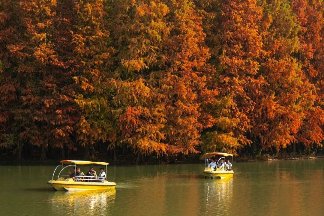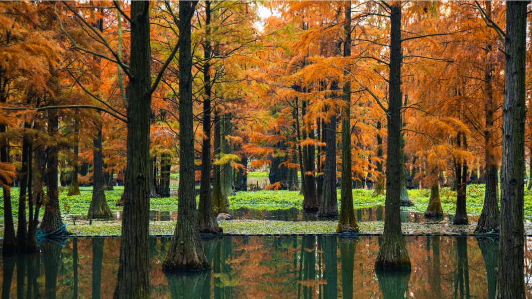 提到水杉,青西郊野公园一定是必打卡地!青西郊野公园,作为上海为数不多的湿地郊野公园,拥有大约60亩的“水上森林”,上海独此一处。走在其中,宛如置身于童话森林。