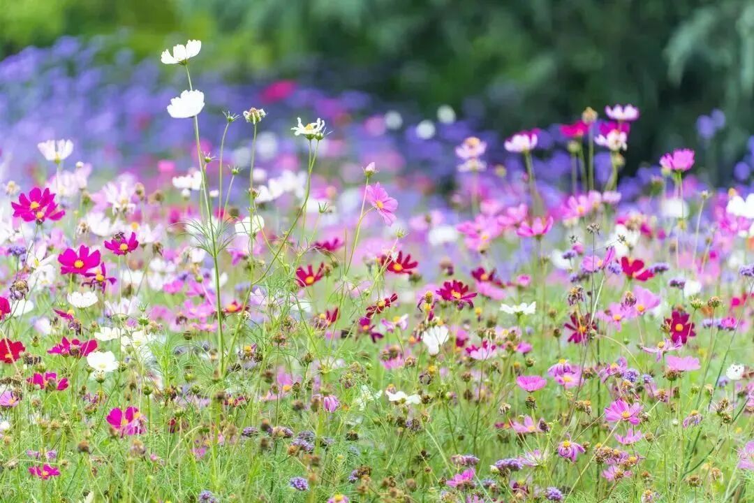 波斯菊开得生机勃勃!置身在花海中,入目皆是艳丽的花朵或粉或白,犹如给绿油油的大地铺上了一层粉白交织的地毯!