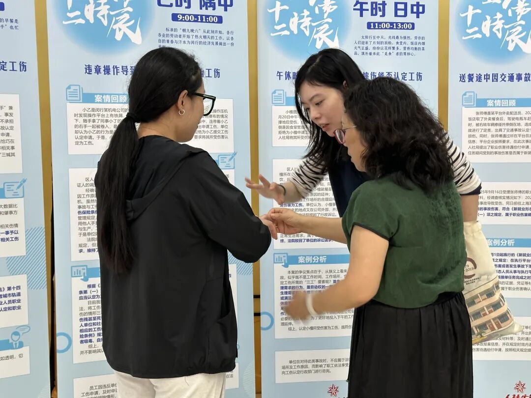 “结束当日订单配送任务后返回日常居所途中因交通事故导致受伤能否确认职业伤害?”“工作时发病后回家拿医保卡就医途中死亡能否认定工伤?”……活动现场,12块展板分别展现了工伤发生的“十二时辰”,回答了劳动者常见的工伤难题。 为增强用人单位和劳动者知法守法意识及工伤预防能力,10月15日下午,闵行区“走进奔跑者”2025年度工伤保险主题集中宣传日活动在颛桥万达广场正式启动,通过“政策宣讲+现场宣解+企业宣教”,为外卖员、快递员、网约车司机等户外劳动“奔跑者”群体送上工伤保险“政策大礼包”。