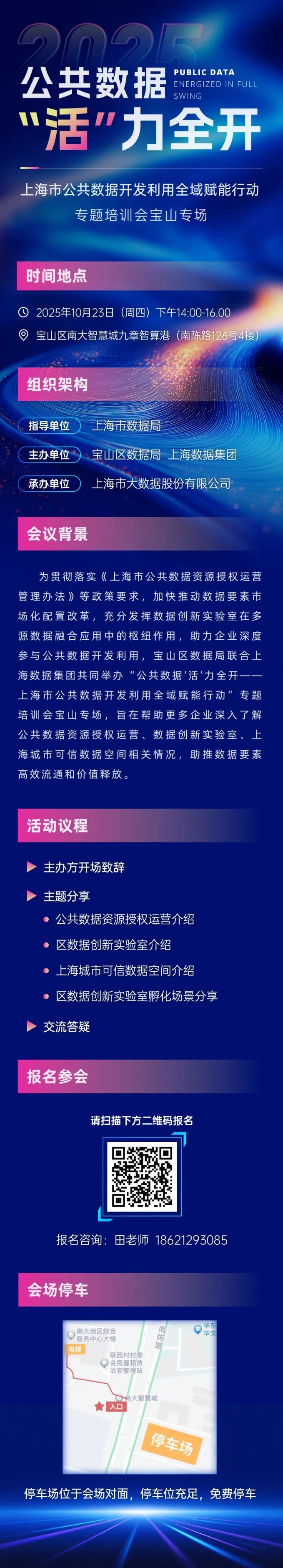 为加快推动数据要素市场化配置改革,助力企业深度参与公共数据开发利用,充分发挥数据创新实验室在多源数据融合应用中的枢纽作用,宝山区数据局将联合上海数据集团,于2025年10月23日(周四)14:00,在南大智慧城九章智算港路演厅(南陈路126号4楼)共同举办“上海市公共数据开发利用全域赋能行动”专题培训会宝山专场。希望通过本次培训和交流,帮助更多企业深入理解公共数据应用价值,助力数据要素高效流通,推动业务创新发展。诚邀相关企业积极参与!