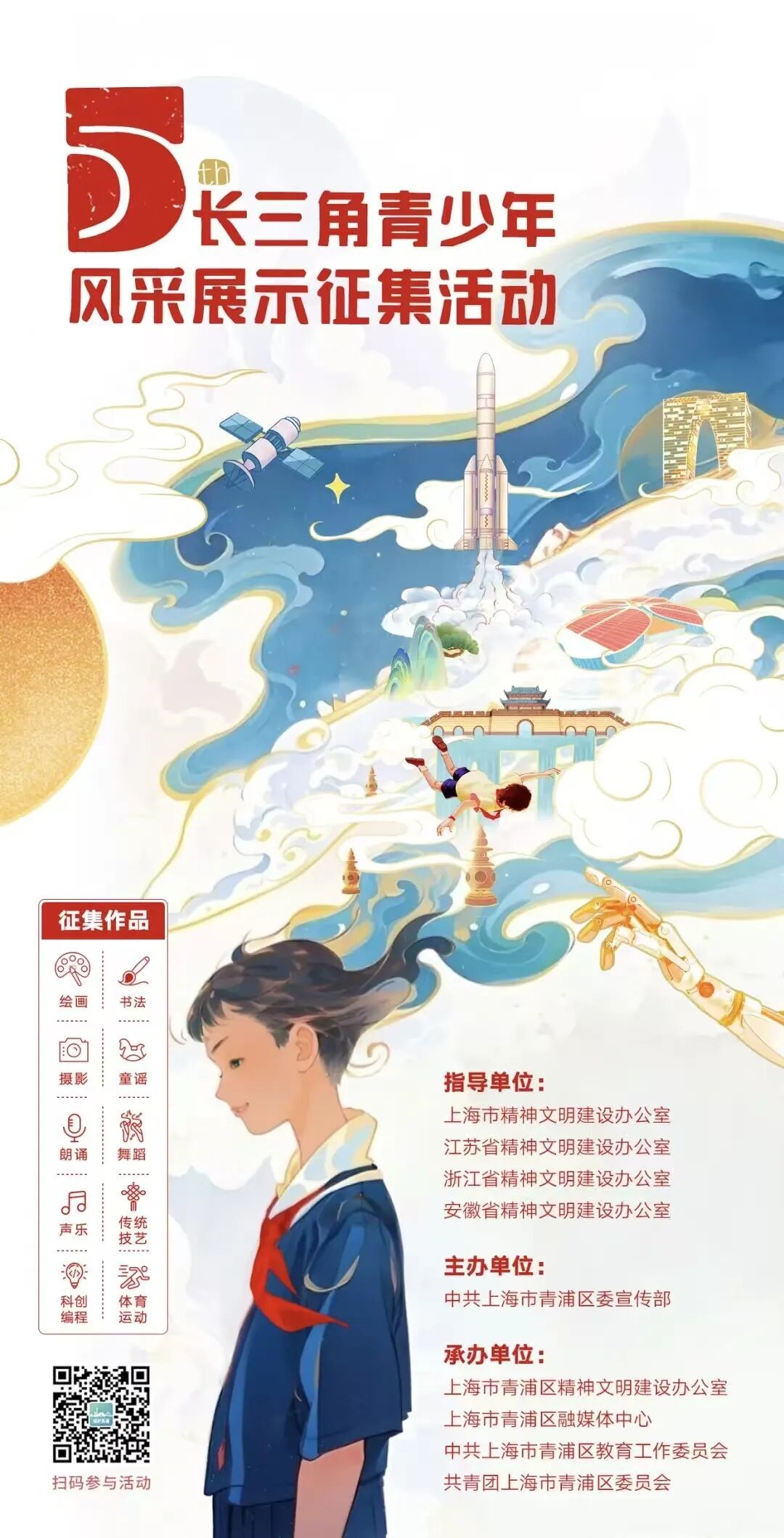 作为长三角一体化进程中未成年人思想道德建设的重要载体,第五届长三角青少年风采展示主题活动旨在以艺术创作、科创实践为纽带,引导青少年厚植家国情怀、传承文化根脉、增强区域认同。活动自4月25日启动以来,获得了长三角青少年的热烈响应,共收到绘画、书法、摄影、童谣、朗诵、声乐、舞蹈、体育、传统技艺、创新十大类别作品超3.5万件,其中青浦作品数5529件,此次评选出505件获奖作品,其中青浦获奖数113件,活动总浏览量超7000万,一批浸润家国情怀、彰显文明素养的佳作从海量投稿中脱颖而出,不仅展现了新时代长三角青少年的精神风貌,更成为区域协同培育时代新人的生动注脚。这些作品每件都展现了青少年们良好的精神风貌,体现着他们对生活、对艺术的追求与憧憬。一起抢先看→