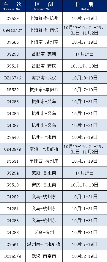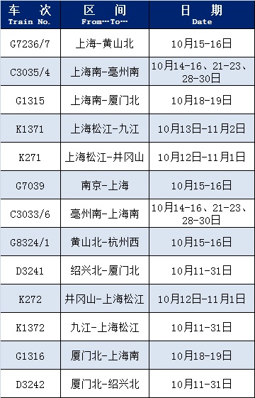 上海铁路客户服务中心介绍,根据旅客出行需求,铁路部门恢复和增开了部分旅客列车。恢复开行列车包括G7236/7(上海-黄山北)、C3035/4(上海南-亳州南)等,增开列车包括G7639(上海虹桥-杭州)、G9440/37(上海虹桥-南通)等,赶快过来看看有没有你需要的车次吧!详见↓