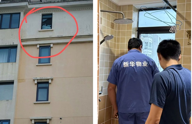 9月17日下午1时许,物业管理室庄经理在小区例行巡查时,敏锐地发现42号8楼某室卫生间窗户玻璃发生自爆,情况十分紧急。庄经理第一时间尝试联系业主,但业主一直没有回复微信。没有半刻耽误,庄经理随即迅速找到业主家属电话告知情况,通知业主赶紧赶回家中。同时,为防止玻璃坠落砸坏楼下车辆以及危及楼下行人,庄经理立即安排人员联系车主挪车,并在周边拉起警戒线,防止行人靠近。