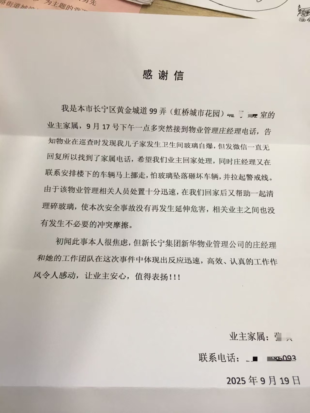 新华物业虹桥城市花园管理室庄经理及其团队及时发现并迅速化解安全隐患的高效行动力,赢得了业主交口称赞,业主家属也是亲自书写感谢信以表达对物业工作人员的肯定。在此次突发事件中,物业管理室以迅速专业的处置能力守护业主安全,用实际行动彰显责任担当。他们不仅用心筑牢小区安全防线,更以温暖真诚的服务态度受到了业主的赞扬。