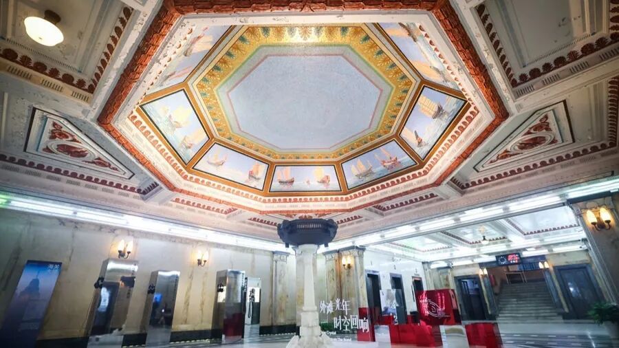 走进一楼大厅,最先吸引目光的是中央的“时空原点”,白玉装置与钟楼旗杆的位置,精准对应着20世纪20年代上海的地理原点坐标。抬头仰望,八角形藻井设计的穹顶壁画令人惊叹,八面壁画皆以一万多颗天然色彩马赛克手工镶嵌而成,绘着帆影点点的海事图景。