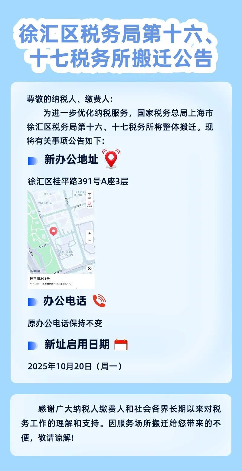 自2025年10月20日(星期一)起,国家税务总局上海市徐汇区税务局第十六、十七税务所整体搬迁至上海市徐汇区桂平路391号A座3层办公。 因搬迁给您带来的不便,敬请谅解!详见↓↓↓