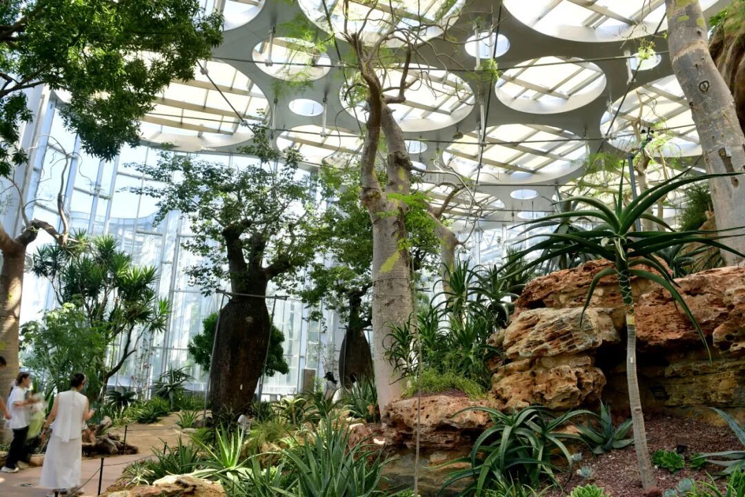 如果说双子山的科技蕴含在山石草木之间,那么温室花园则是用科技带给市民游客一场奇妙之旅。上海温室花园是目前亚洲最大的温室花园,从百年钢厂旧址拔地而起,温室幕墙和结构一体化设计的无柱大跨空间,屋面采用空间张弦异形平面网格铝合金结构实现建筑的轻盈飘逸。