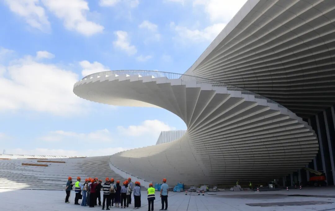 而就在今年8月中旬,位于世博文化公园内的艺术殿堂——上海大歌剧院主体基本建成,其独特的“中国扇”造型惊艳亮相。从空中俯瞰,剧院就像一把徐徐展开的白色中式折扇,阶梯呈螺旋式上升,延伸至天空,恰似打开的折扇,与黄浦江景及世博文化公园的自然景观相融合。据了解,针对中心蜿蜒而上的双螺旋楼梯轻薄且无支撑的结构形态,建设团队采用了两项世界首创的施工工艺——核心区外圈的15米超长、强度高达165MPa的UHPC(超高性能混凝土)悬挑预应力梁板结构,核心区内圈厚1.5米的现浇双螺旋自由曲面混凝土厚壳。上海大歌剧院预计2025年底全面竣工。