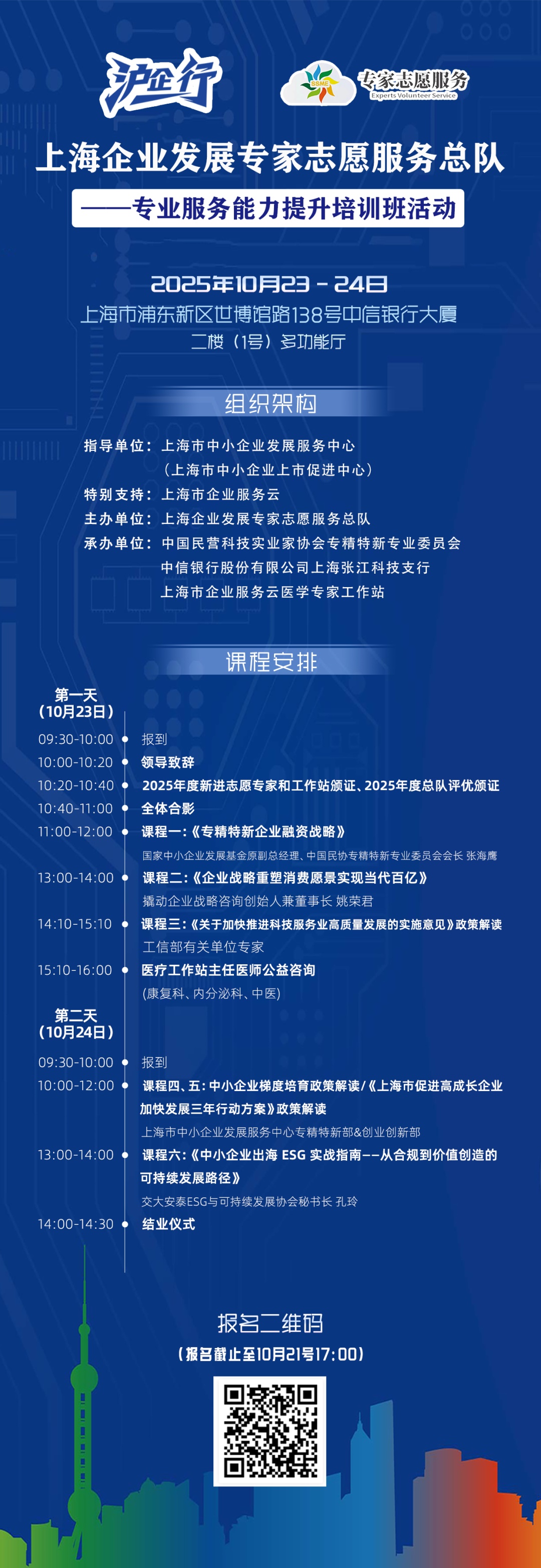 为进一步提升志愿服务团队能力素质,打造专家与企业间充分沟通平台,总队将于2025年10月23-24日共同举办专业服务能力提升培训班,为总队的专家和工作站提供政策解读、宏观经济、资本市场、战略规划等课程。现将有关事项通知如下: