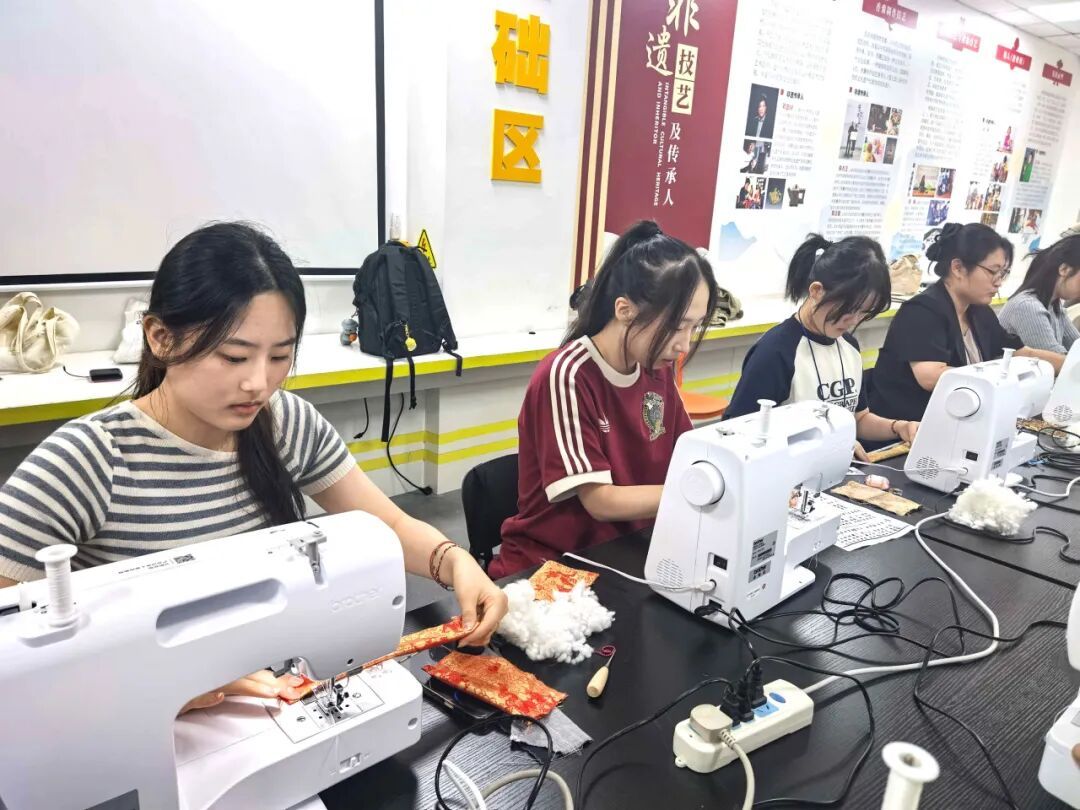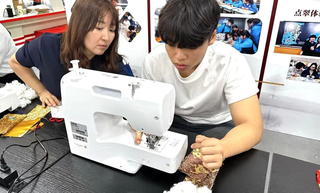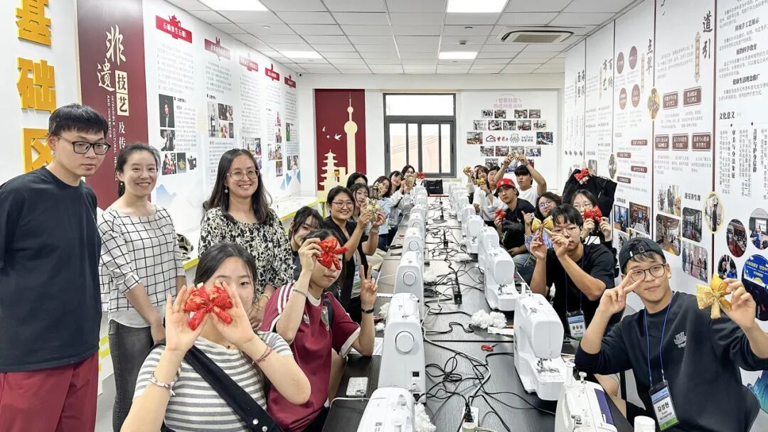 韩国师生还在专业老师带领下,共同学习中国非物质文化遗产——宋锦的制作技艺。大家选取心仪的颜色,专注地折叠、固定,亲手将一块块精美的宋锦料,制作成一个个别致典雅的蝴蝶结挂饰。对于韩国师生而言,这不仅仅是一个手工纪念品,更是一份来自上海普陀的、触手可及的文化记忆。一位韩国学生捧着自己的作品爱不释手:“我会把它好好珍藏起来。每次看到它,都会想起在上海、在普陀度过的这段美好时光。”