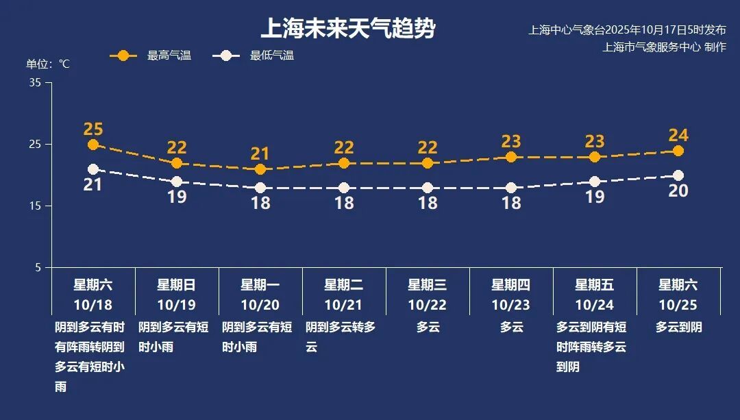 10月18日(周六):阴到多云有时有阵雨,21~25℃