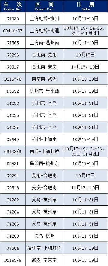 上海铁路客户服务中心介绍,根据旅客出行需求,铁路部门恢复和增开了部分旅客列车。恢复开行列车包括G7236/7(上海-黄山北)、C3035/4(上海南-亳州南)等,增开列车包括G7639(上海虹桥-杭州)、G9440/37(上海虹桥-南通)等,赶快过来看看有没有你需要的车次吧!详见↓