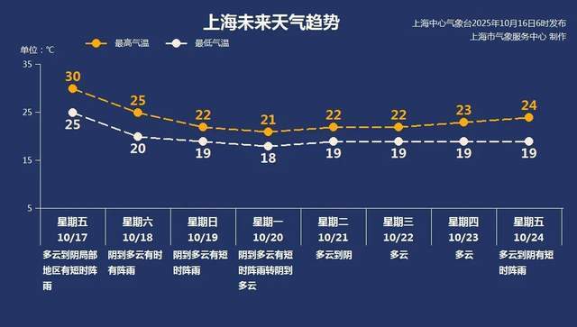周五冷空气还没影响到上海,气温会有个小反弹,最高再度升至30℃左右。预计周六早晨前后,冷空气前锋抵达上海,又刮风又下雨,气温也将明显下降。后续冷空气陆续补仓,风力持续偏大,周日和下周初市区最低气温降至18~19℃,最高22℃上下。体感将由目前的偏热转为舒适,甚至偏凉。
