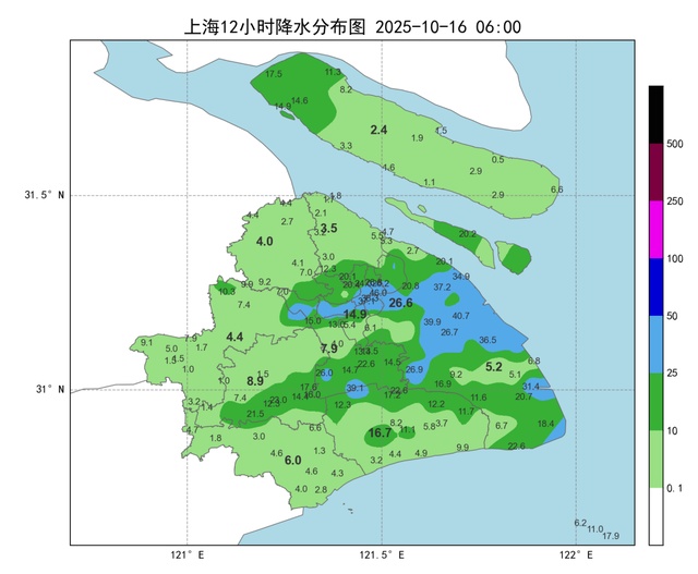 10月15日晚上和16日早晨,本市出现阵雨或雷雨天气,局部雨势较明显,市区、浦东等地区达到了大雨的程度。16日上海是阴到多云有分散性短时小雨的天气,雨势总体不大。气温有所回落,早间全市最低气温多在23℃上下,预计今天最高气温27℃左右。北到东北风3~4级,沿江沿海地区4~5级,相对湿度在95%~65%之间。