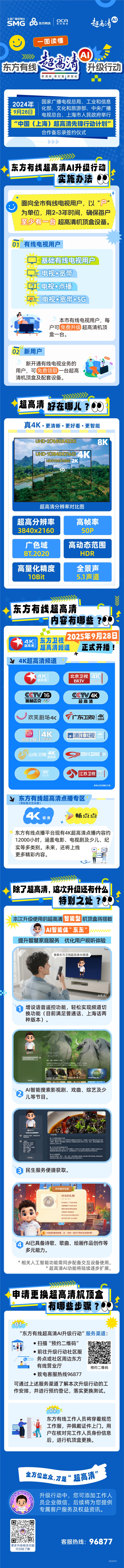 东方有线介绍,自2025年9月16日起,在全市范围内开展有线电视超高清服务升级,按照“一户一端”标准,分批逐步开展入户升级工作。在升级行动开展期间,本市有线电视家庭用户可免费更换1台超高清AI机顶盒。更换超高清AI机顶盒后,用户无需增加收视费用,即可收看12套超高清频道。“超高清AI升级行动”实施办法、包含内容、申请更换超高清机顶盒步骤等,详见↓