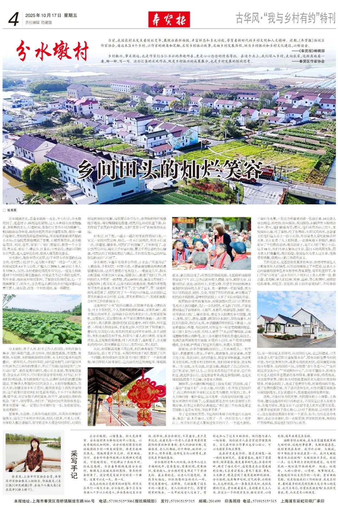 当前,我国农村正发生着深刻变革,展现出崭新面貌、丰富样态和多元功能,孕育着新时代的乡村文明和人文精神。近期,《奉贤报》协同区作家协会,遴选本区9个乡村,以作家的视角和笔触,采写乡村振兴故事,反映乡村发展历程,助力乡村振兴和乡村文化建设,以飨读者。