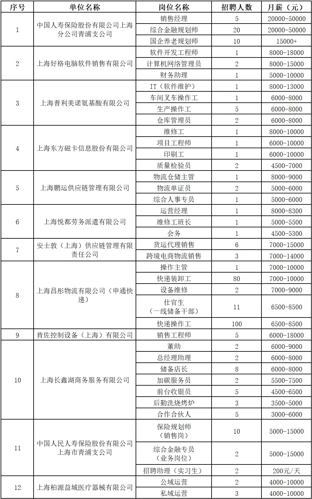 为深入贯彻党的二十大精神,全面落实中央、市委和区委关于稳就业工作决策部署,强化高校毕业生等青年群体就业服务,区人社局将于10月18日举办“攻坚促就业 奋进创未来”2025年全国城市联合招聘高校毕业生专场暨秋季综合招聘会。 快递物流、现代服务、工业自动化等行业岗位正在火热招聘,314个就业机会虚位以待! 一、招聘会信息 时 间 : 10月18日(周六)9:00—11:00 主 题 : “攻坚促就业 奋进创未来”2025年全国城市联合招聘高校毕业生专场暨秋季综合招聘会 形 式 : 线上线下同步 主 办 : 青浦区人力资源和社会保障局 承 办 : 青浦区就业促进中心 协 办 : 长三角人力资源市场 线 下 地 址 : 长三角人力资源市场(青浦区北青公路8098号4楼) 线 上 地 址 : “乐业上海第一站”http://jobs.rsj.sh.gov.cn 二、岗位信息表 三、公交线路 乘坐香花桥1路至北青公路汇金路(公交站); 乘坐青浦7路至汇金路北青公路(公交站); 乘坐青浦21路、青浦22路至青浦出口加工区(公交站); 乘坐青浦30路(原青凤徐专线东段)至北青公路汇金路(公交站); 乘坐轨交17号线至汇金路站1号口出,转青浦7路。 资料:青浦人社 编辑:陈卓、沈千慧