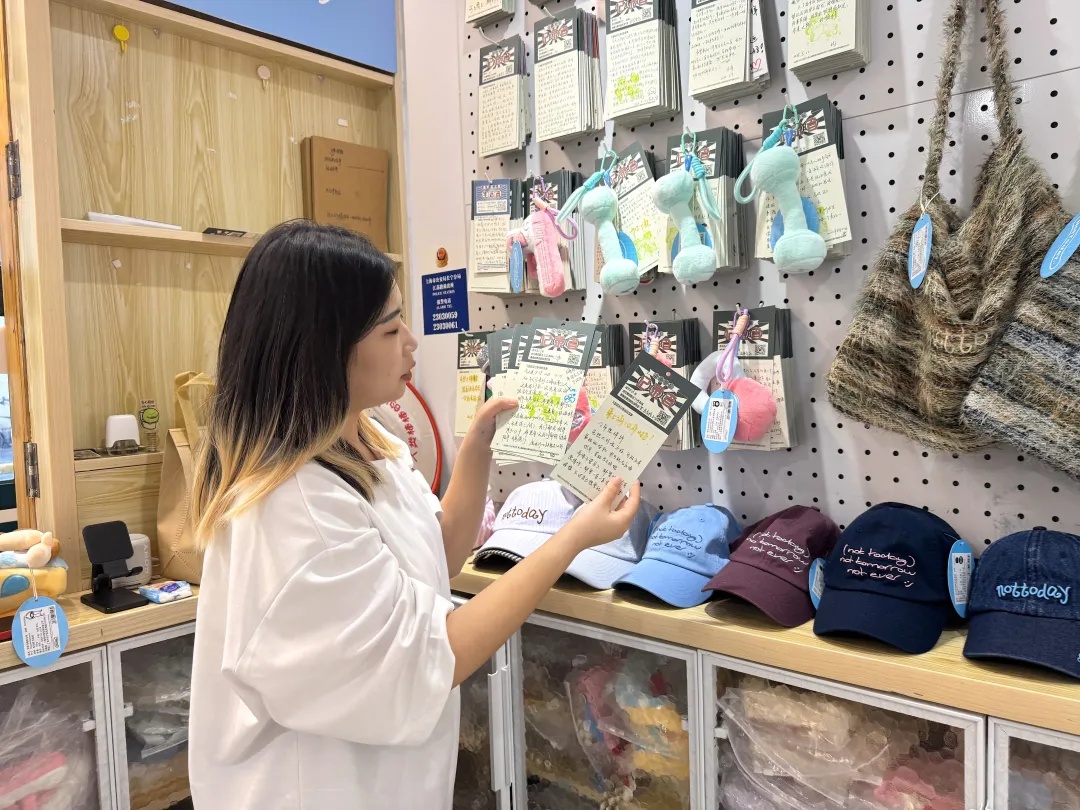 更多人从墙上悬挂的一张张故事卡片中了解到了愚园路的过往,也留下了自己在愚园路、在上海的故事。张洁则邀请本就身为艺术家、设计师的“一月店长”们深度游览愚园路,了解钱学森、顾圣婴、施蛰存等名人名家在此生活、工作的过往,创作各类以愚园路为主题的文创产品。“荒核”的创始人,“85后”李椰就专门为愚园路设计了香片挂件,目前已经是最受欢迎的愚园路文创之一。