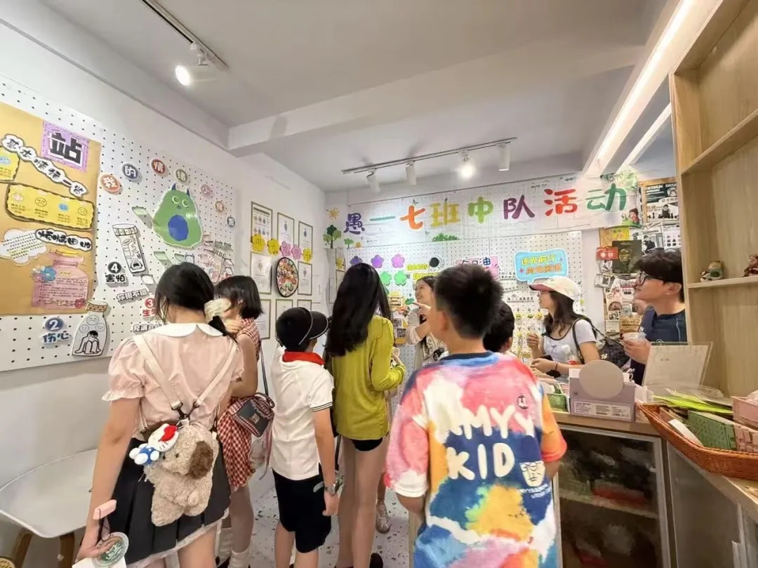 愚园路第一小学则将故事商店作为校外社会实践基地,今年7月以“时光纽带·同心共融”为主题,五个班级的同学连续五天带来不同主题的活动和展览,义卖画作并将善款用于帮扶甘肃山区中的同龄人。为期一周的“小店长”生涯不仅带给孩子们新奇的体验,也让周边居民和市民游客感受到了温暖的正能量。