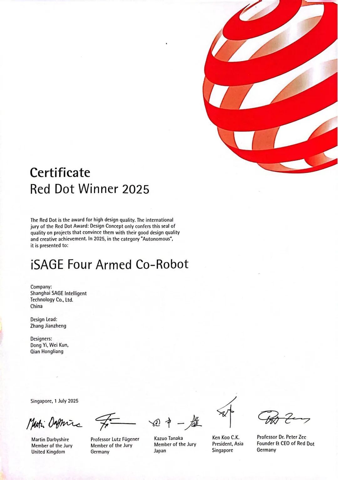 红点奖素有“设计界的奥斯卡”之称,被公认为国际上创意和设计的认可标志,是全球设计的风向标。作为国际公认当代工业设计领域中最具声望的大奖,飒智智能与Figure 2等多家全球知名机器人企业一同跻身获奖名单,不仅是对飒智智能四臂类人作业机器人的设计理念、技术创新和用户体验的高度赞扬,更是对中国机器人产业的发展和创造力的充分认可。