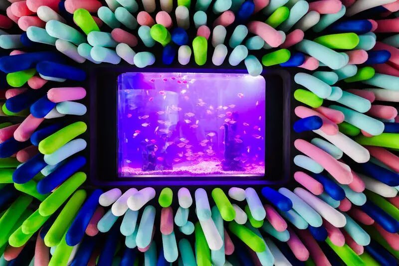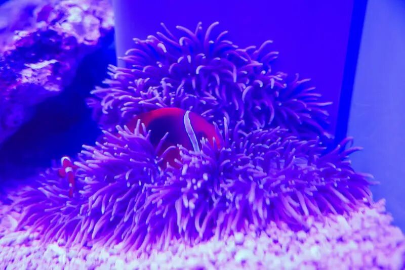 水族箱中,海葵中藏着鲜艳的小丑鱼。