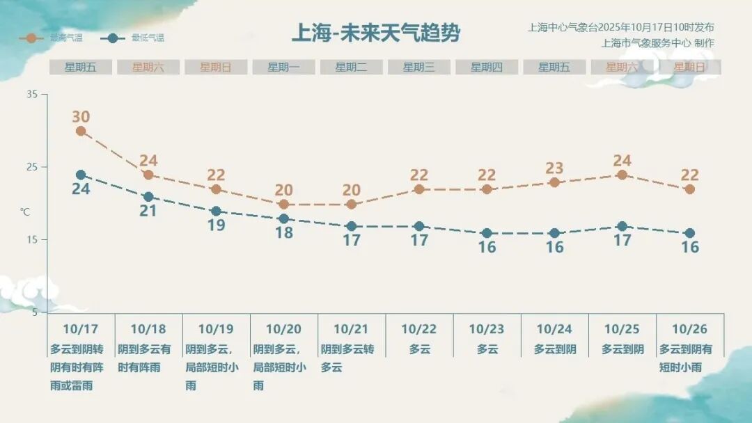 上海中心气象台2025年10月17日11点钟发布的冷空气消息:北方有一股较强冷空气正在南下,今天10点钟,它的前锋已经到达华东北部,预计明天早晨前后开始影响本市,气温将明显下降,并伴有7-8级偏北大风,华东沿海海面从今天下午起,自北向南先后有8-10级偏北大风出现,希望各有关方面注意。